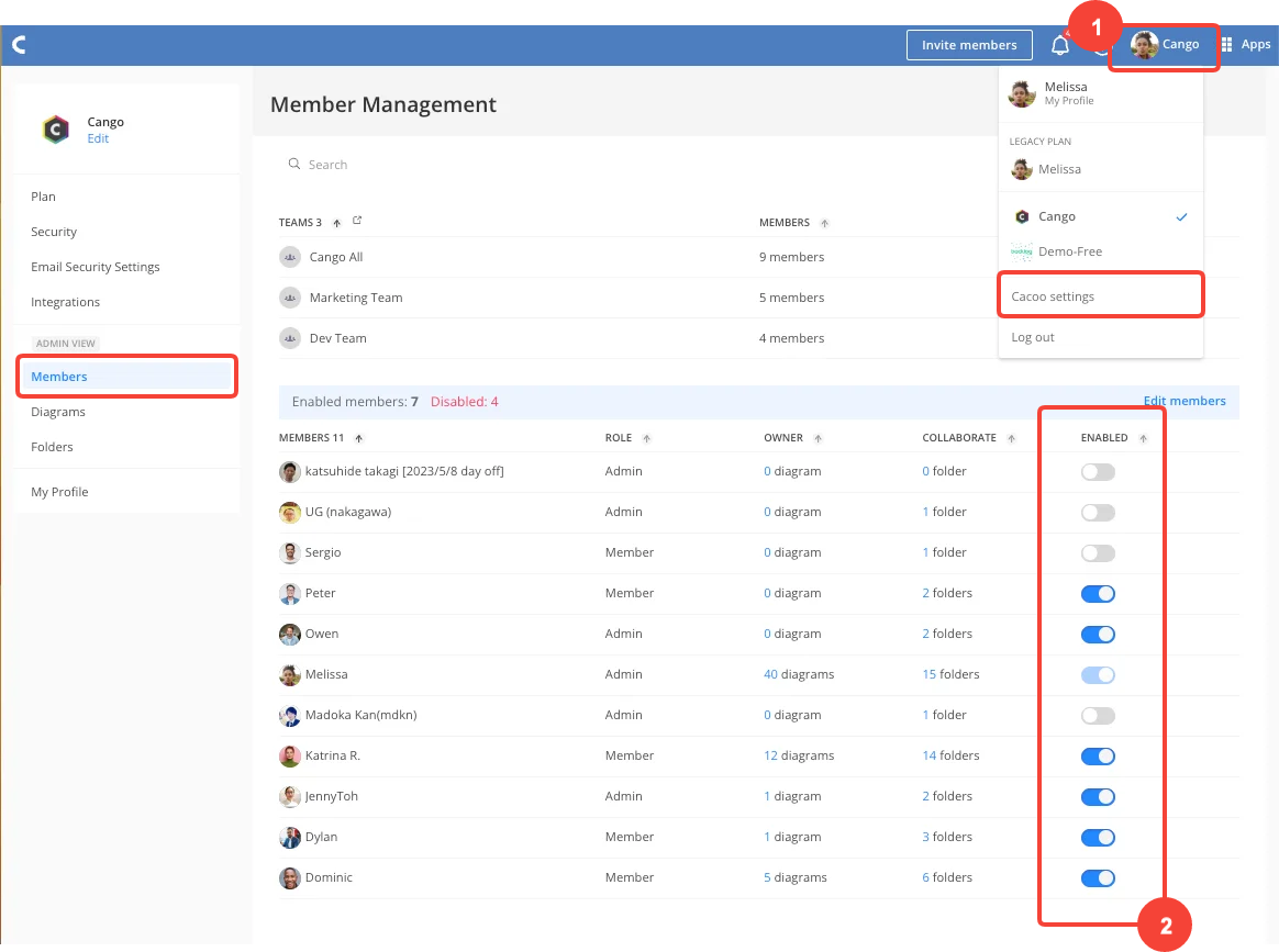 First, use the Global Navigation to access the Cacoo settings menu. Then, open the Member Management tab.