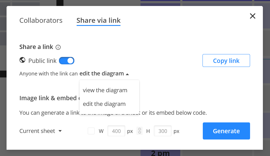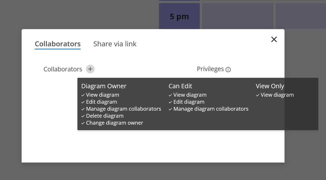- Diagram owner: has full access, including adding new collaborators, editing, deleting, or reassigning ownership