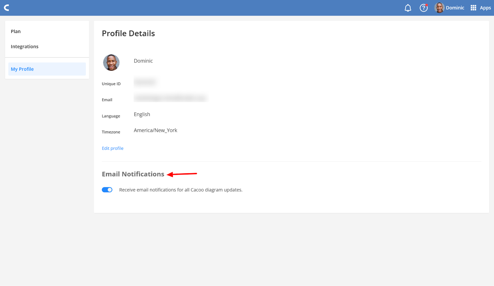 Second, you and your team can opt into email notifications by opening the Cacoo Settings menu and the My Profile tab.