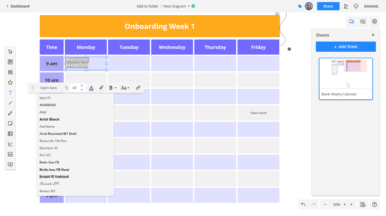 Click on the template you want to use, and it will open in a new window. For this example, we’ll use a basic calendar template to schedule our onboarding process and help your new employees understand what they can expect in their first week.
