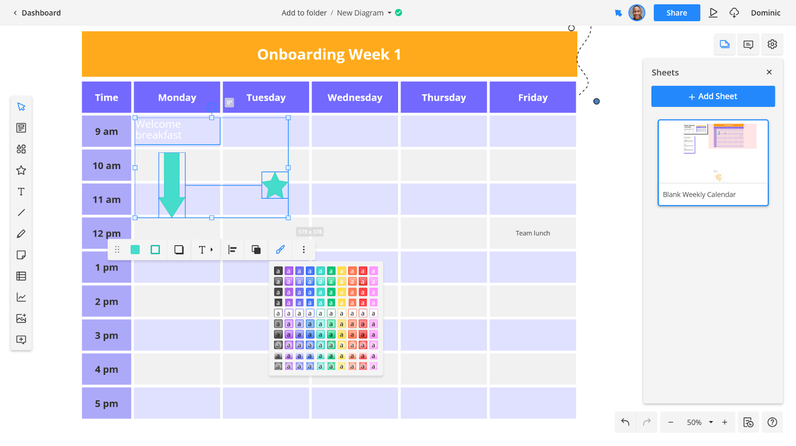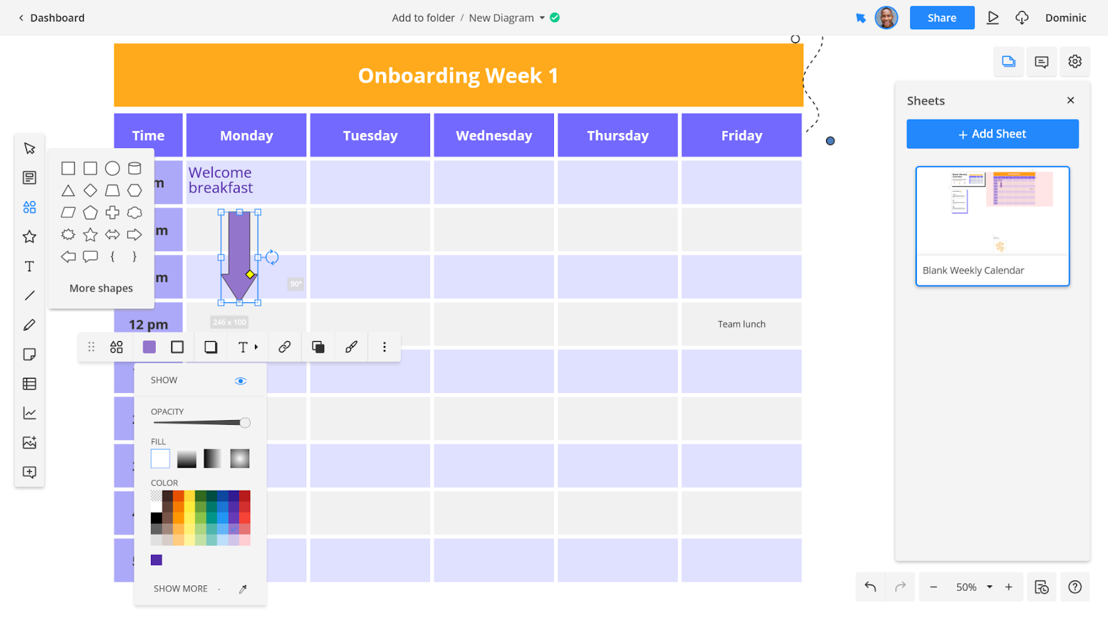When you select a shape, it will appear in the center of the screen. Click and drag to move or rotate it into position. When the shape is selected, an editor menu will appear. (In the image above, we rotated it and turned it purple). This drag-and-drop editor is very intuitive, making it easy for everyone to learn how to use Cacoo quickly.