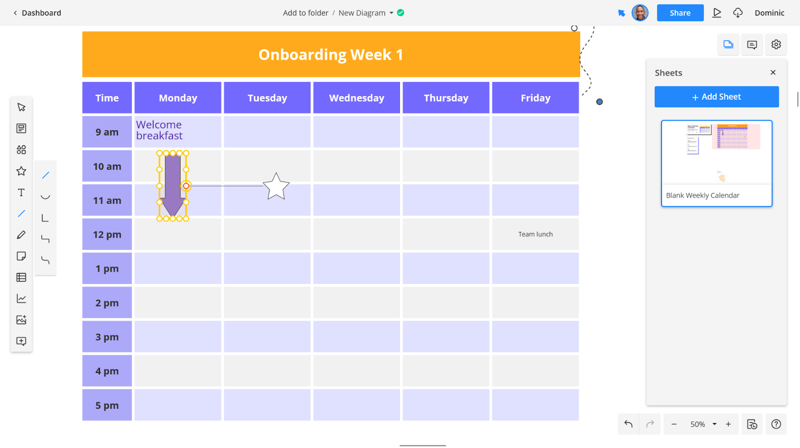 Use the connector tool to show a relationship between two elements – for example, if you’d prefer to depict your onboarding process as a flow chart.