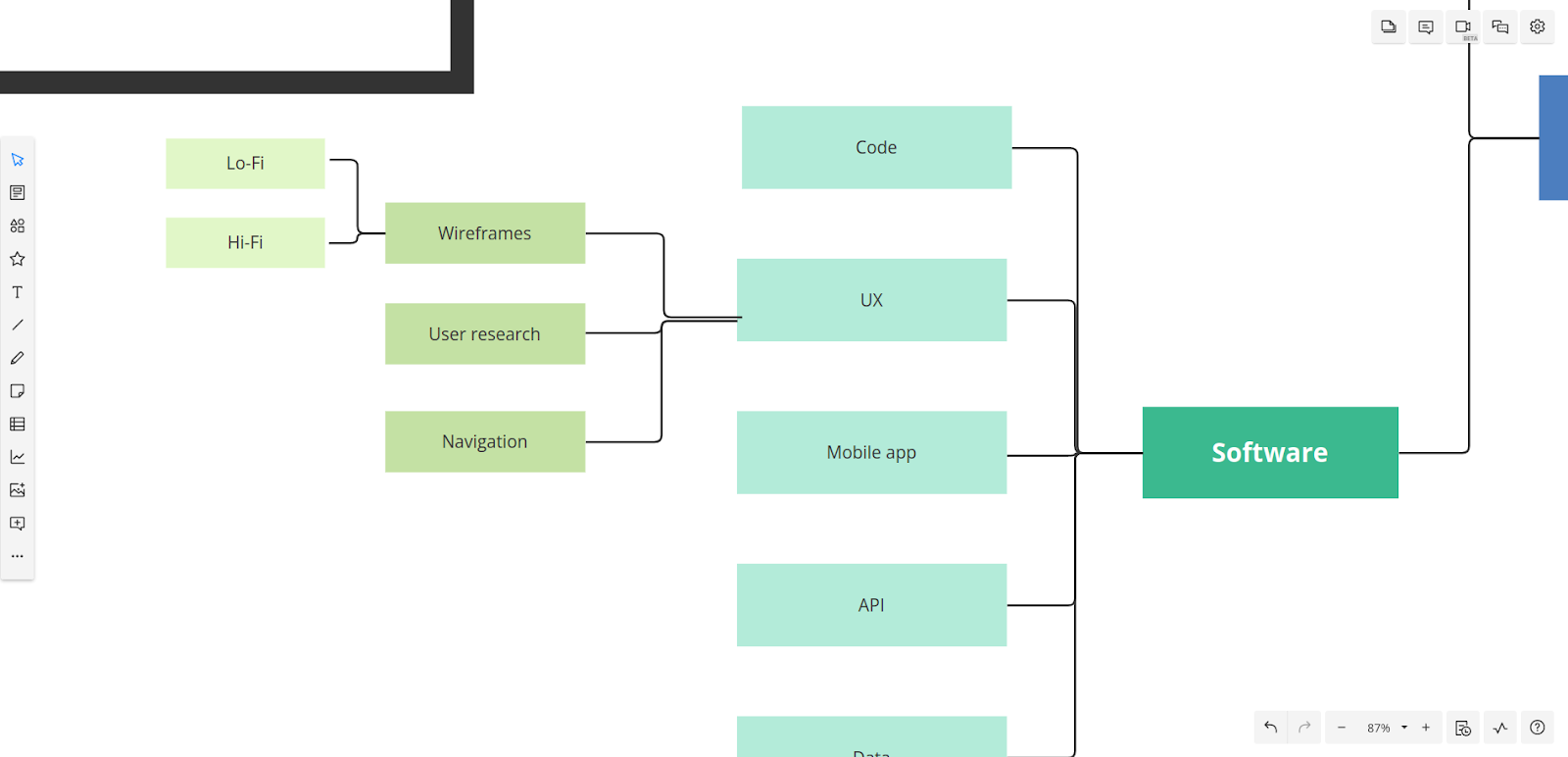From there, we can break it down even further. For example, let’s zoom in on the Software UX and add some sub-topics for wireframes, user research, and navigation. Then, we’ll dig further into wireframes to include both hi-fi and lo-fi designs. One of the great things about mind mapping is that we can get as granular as we want.