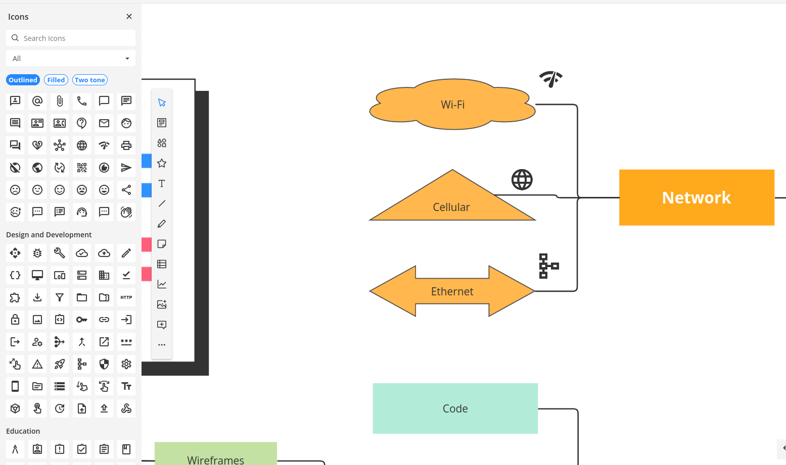 That doesn’t mean that you’re constrained when it comes to design. Cacoo’s design flexibility lets you make your mind maps look exactly like you want them to look so they are easy to read and understand. For our example, let’s add some helpful icons to our networking section. These icons come included in Cacoo and are easy to access throughout the navigation bar to the left.