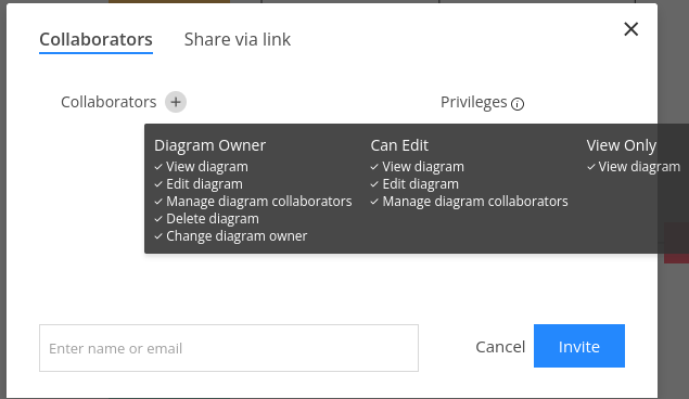 To share a diagram, you can add collaborators, either by name or email, and assign them privileges and roles. Diagram owners have the most comprehensive permissions, so ‘Can Edit’ or ‘View Only’ will be the most appropriate options for most team members and stakeholders.
