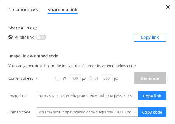 You can also share your Cacoo diagrams and mind maps via a link. You can make a public link that can be shared anywhere, and you can generate a link to an image of the sheet or HTML code so that you can embed it into a website.