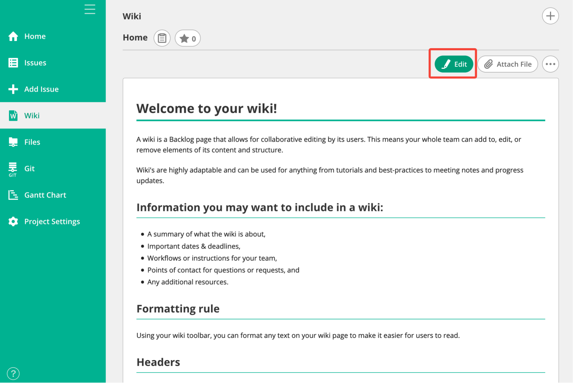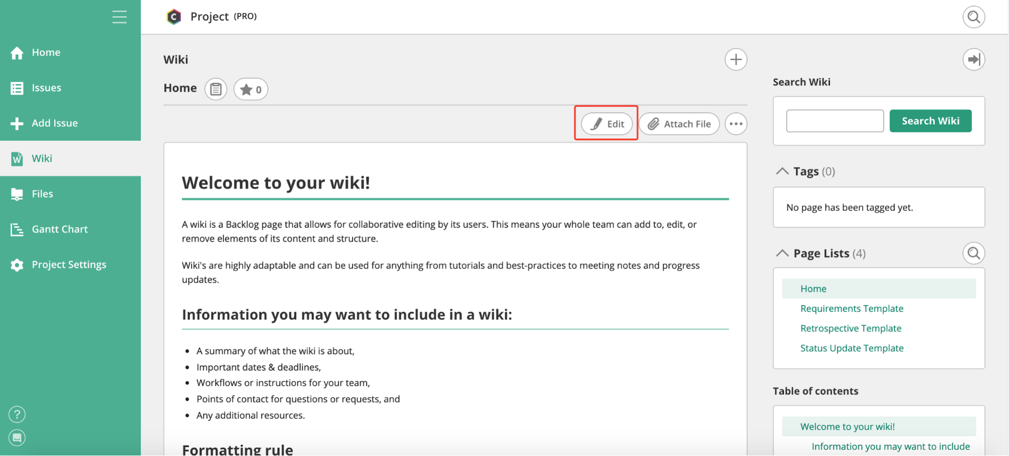 Wikis can have a variety of uses and applications, but they usually share a few key functionalities. We’ll walk you through each of these features using the wiki in Backlog.