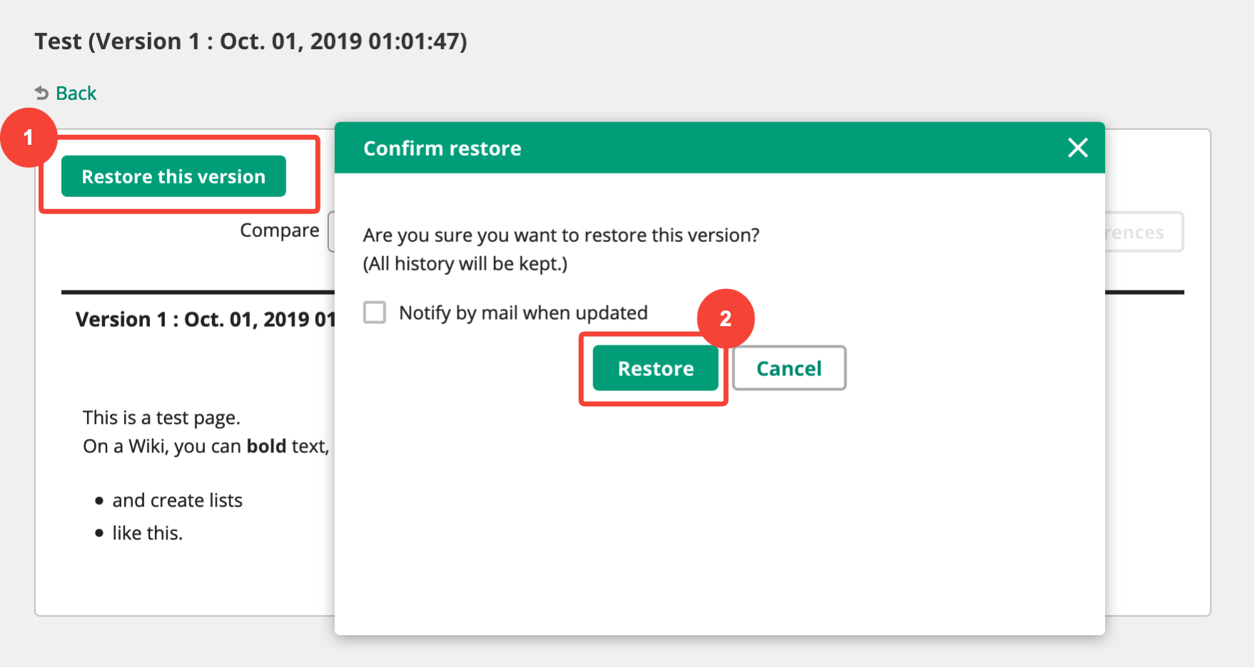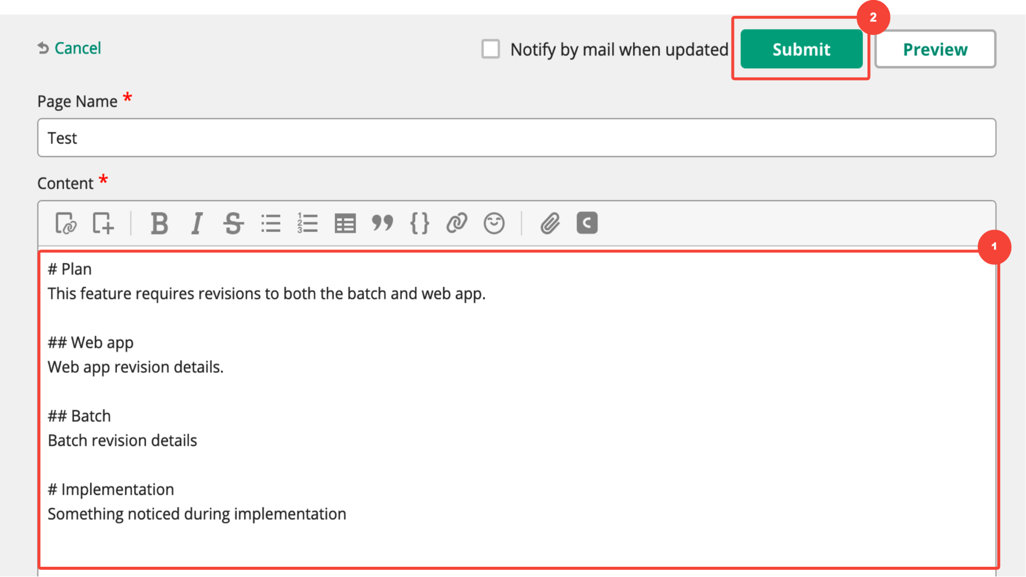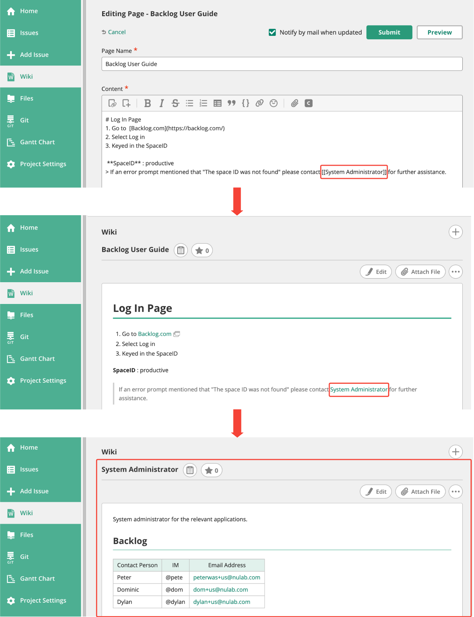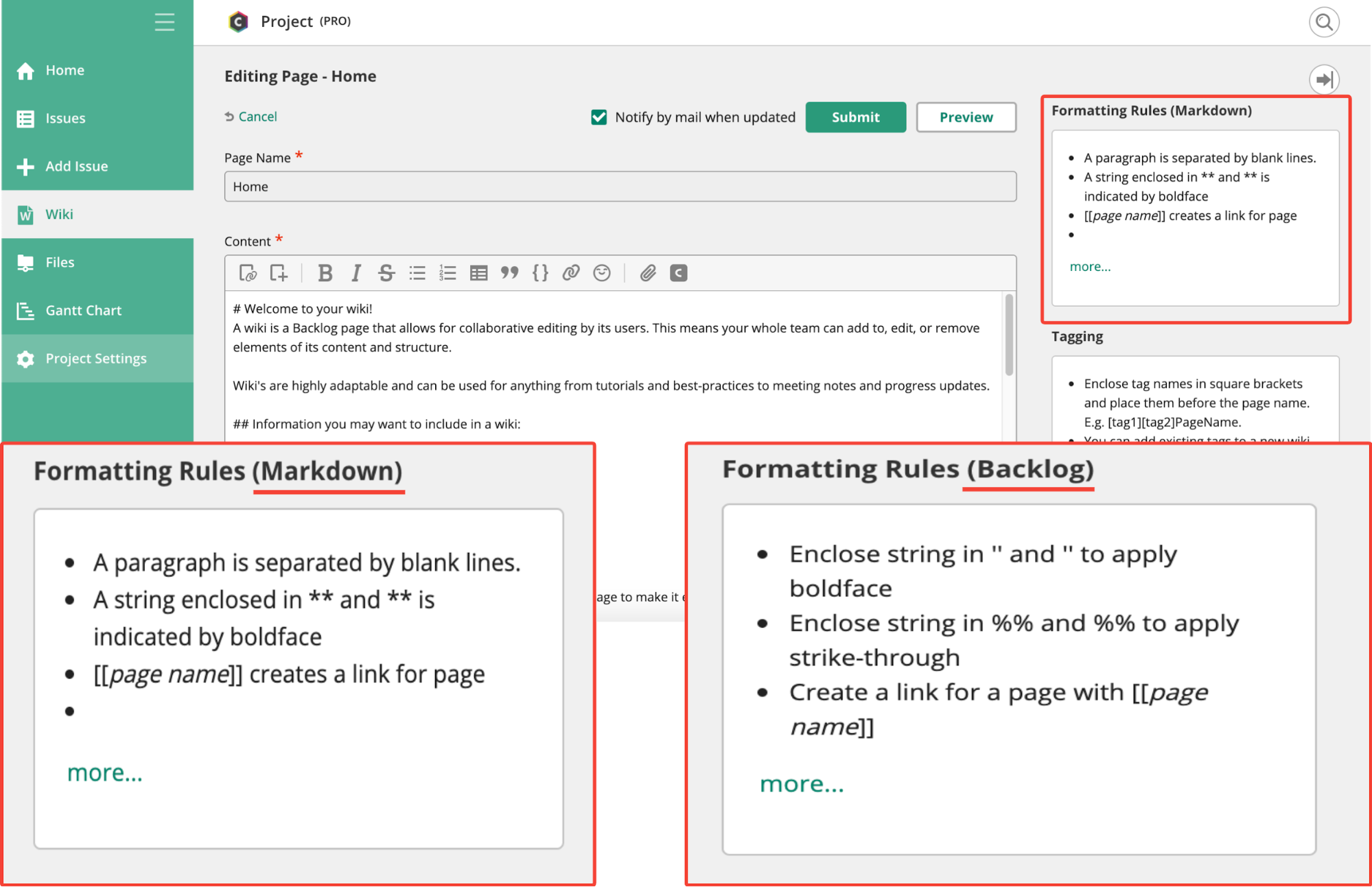 Some wiki services (including Backlog’s wiki feature) will notify the original author of any edits by email. This helps authors monitor contributions for accuracy and stay up to date on changes.