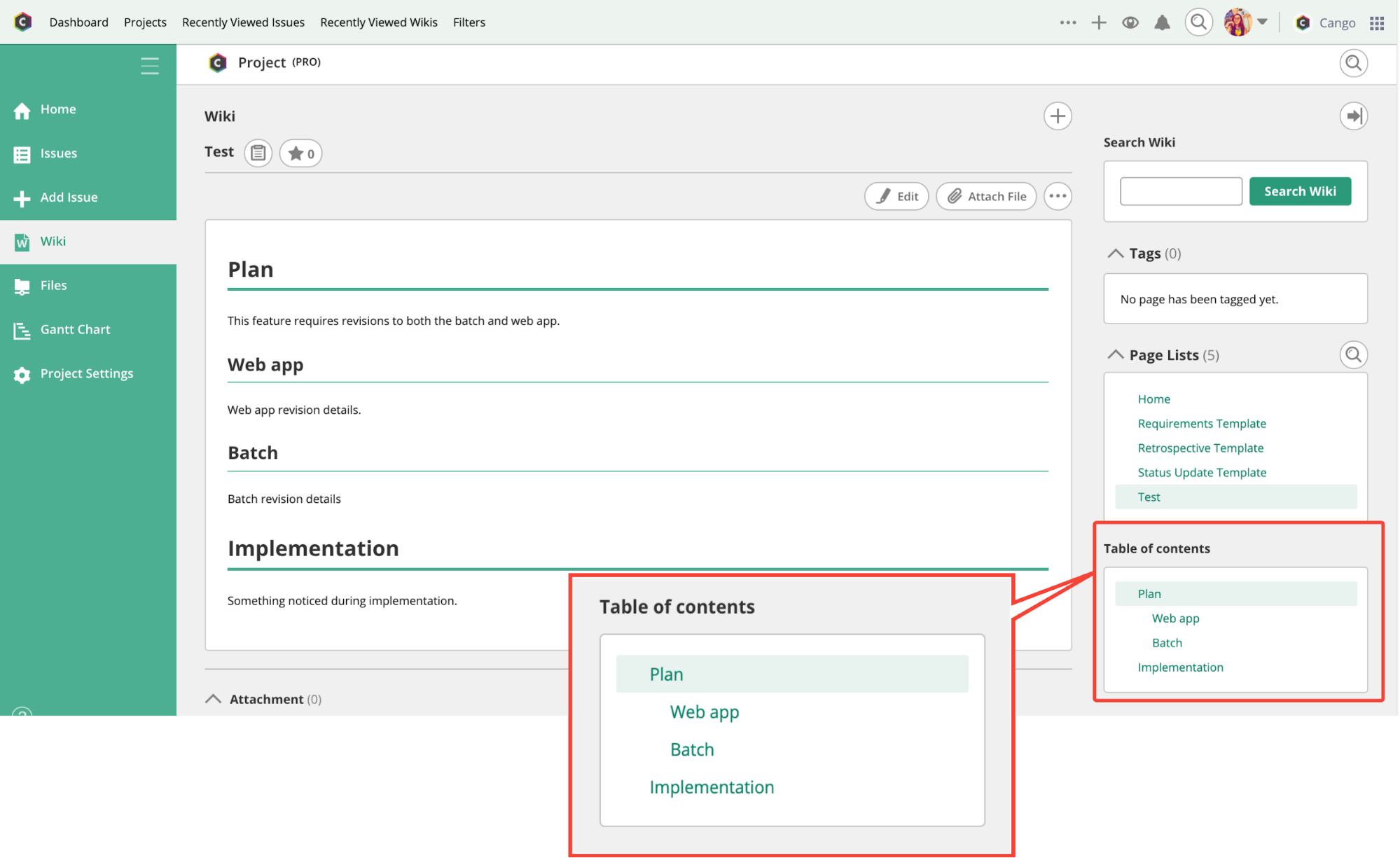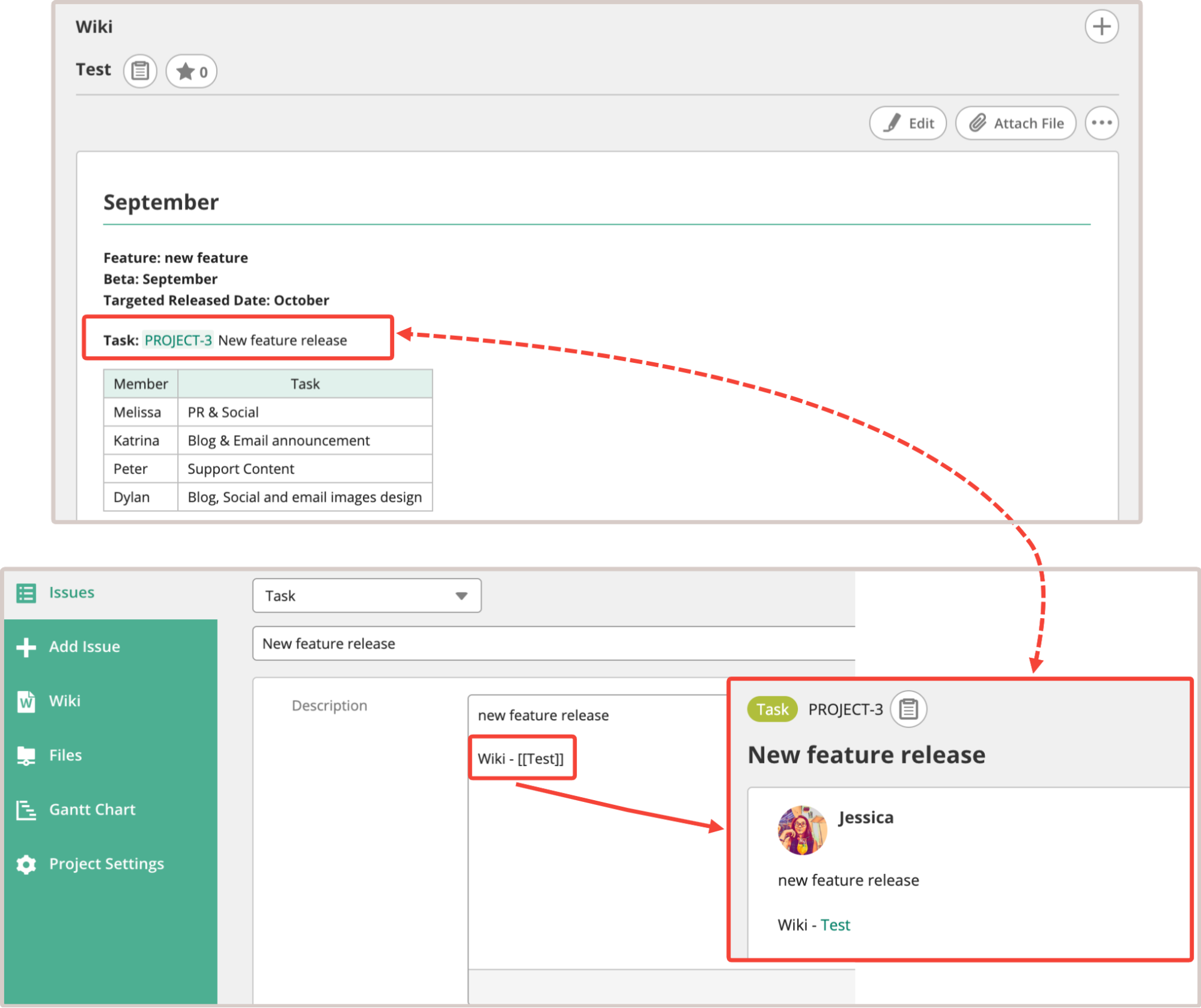 With Backlog, you can easily link Wiki pages and tickets. Adding a ticket key (e.g. PROJECT-3) to the Wiki page will automatically turn it into a link to the ticket page.