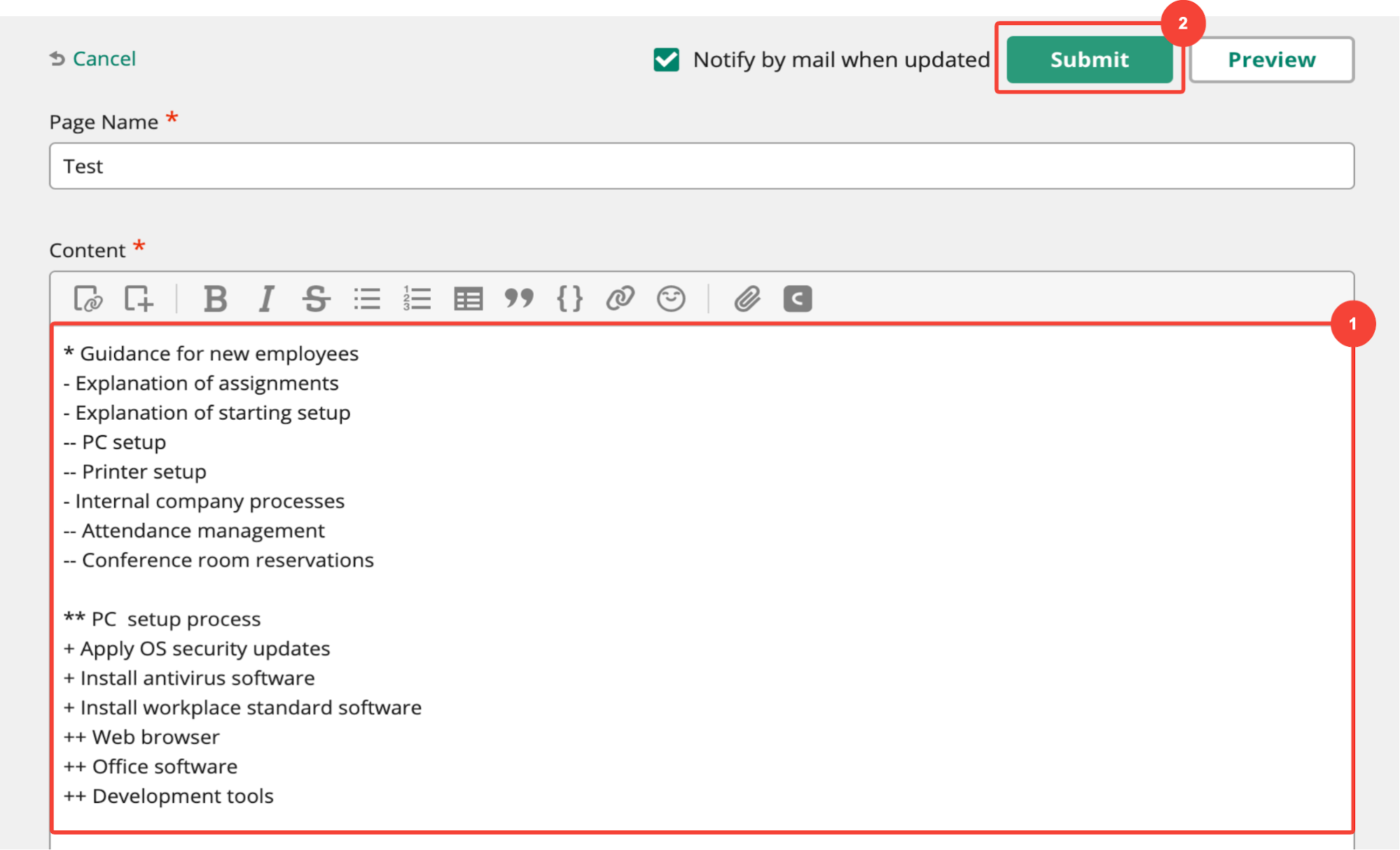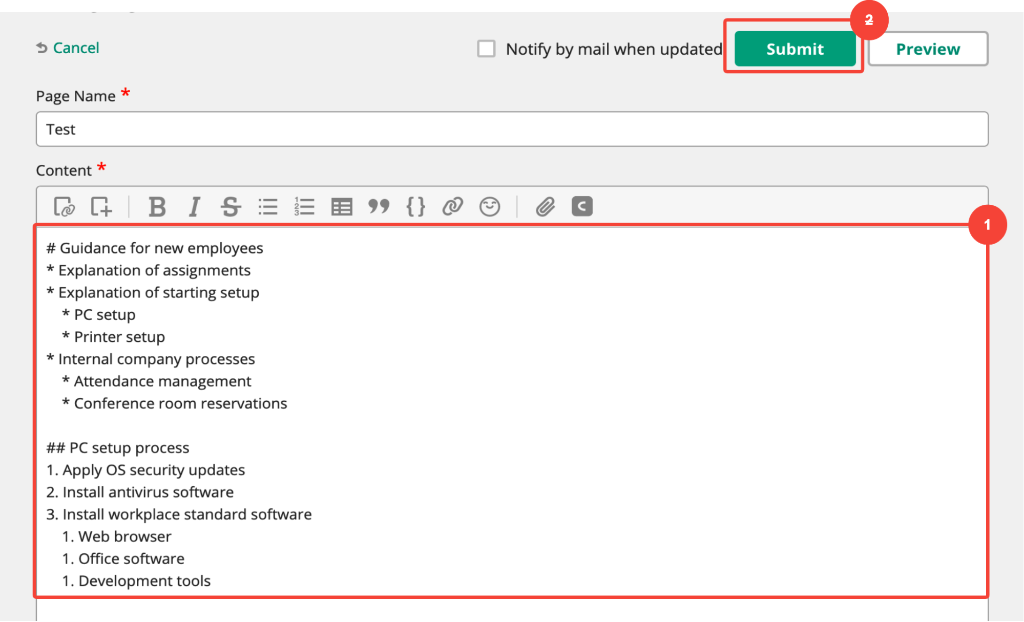 Published pages can be edited by anyone who reads them. If, for example, you notice that a page created by someone else contains inaccurate/outdated information, you can open the editing screen and correct that information directly. Just “Submit”, and the page’s contents will update immediately.