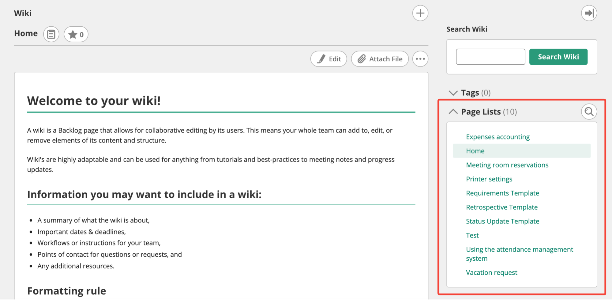 In the first half of this tutorial section, we walked through the features available in Backlog’s Wiki. You learned how to create Wiki pages, make them easy to read, and maintain them over time.