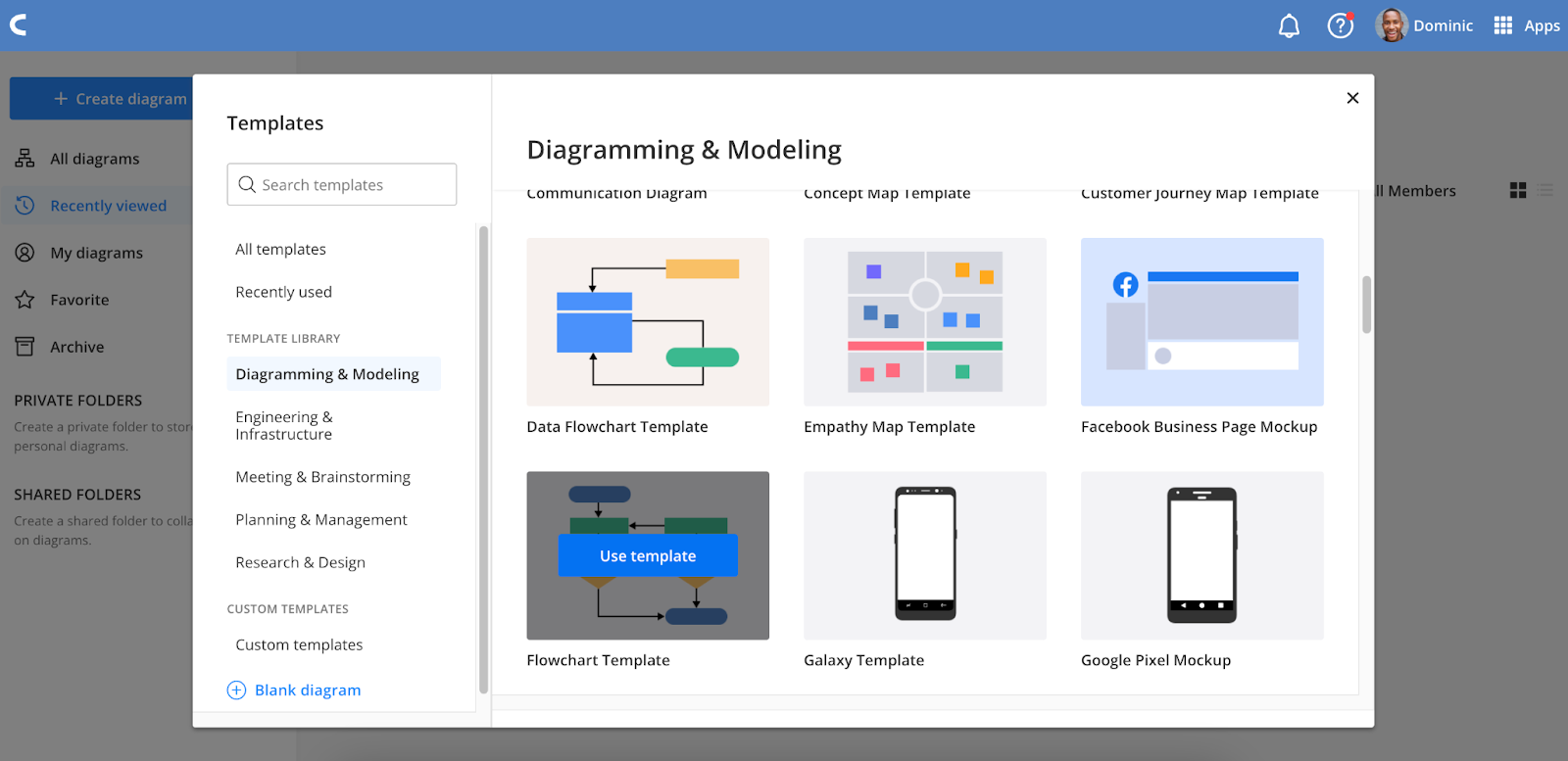 To get started, log in to your Cacoo account and navigate to the Cacoo template library. Browse the templates until you find the one best matched to your needs. You can find our flowchart templates under the Diagramming & Modeling category.