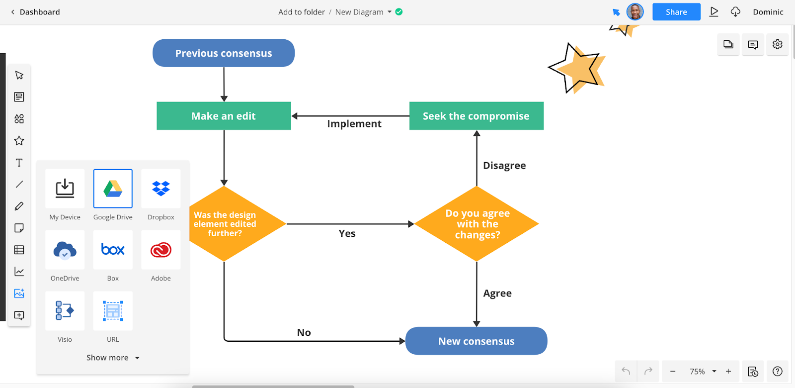 If you’d like, you can even import design ideas from external sources, including Google Drive and Adobe Creative Cloud, thanks to Cacoo’s built-in integrations. To import these concepts, click the Import icon in the diagram toolbar and select the platform from which you’d like to import files.