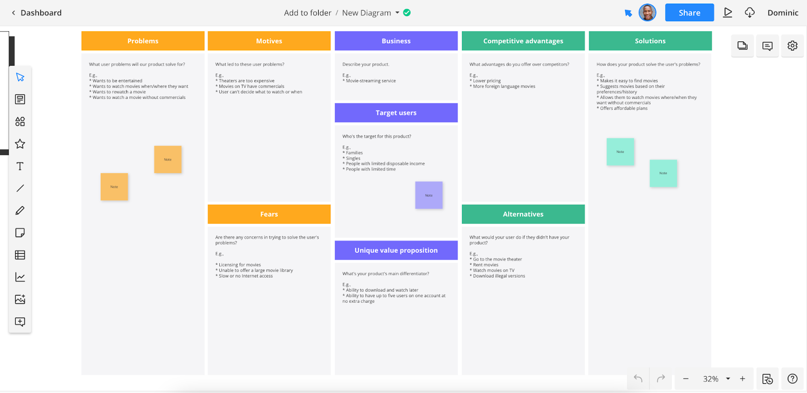 Click Use template to open up a new diagram. From here, you can customize the template to your exact needs, using Cacoo’s drag-and-drop interface to add new shapes, edit text, update colors, and more.