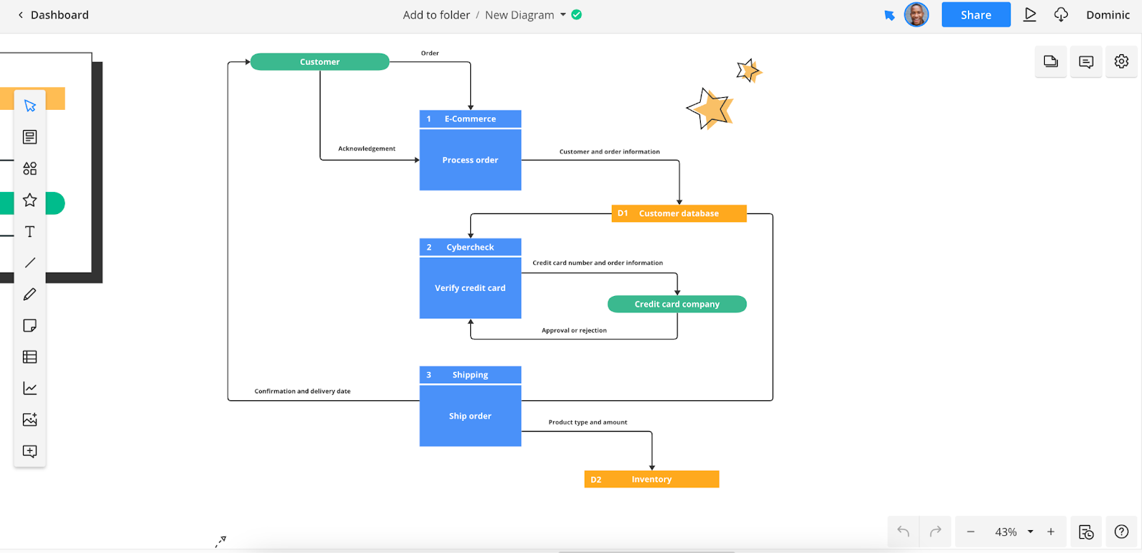 Consider the below data flowchart for an eCommerce website. This flowchart displays the various steps that must be completed between a customer ordering a product online and the business shipping it out to them. The design team in charge of launching the new website wants to verify that other stakeholders in the business are aligned with this design process before finalizing the website design.