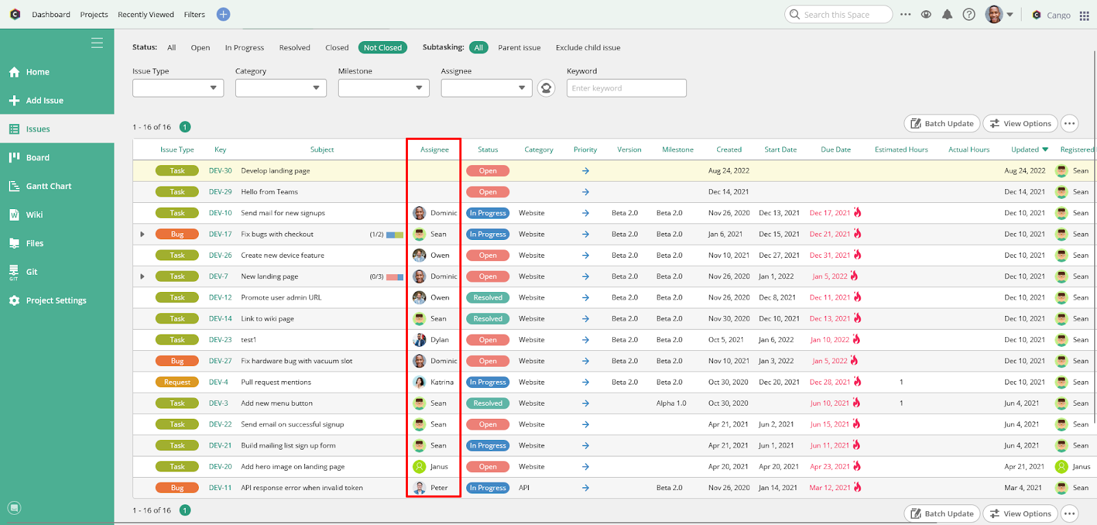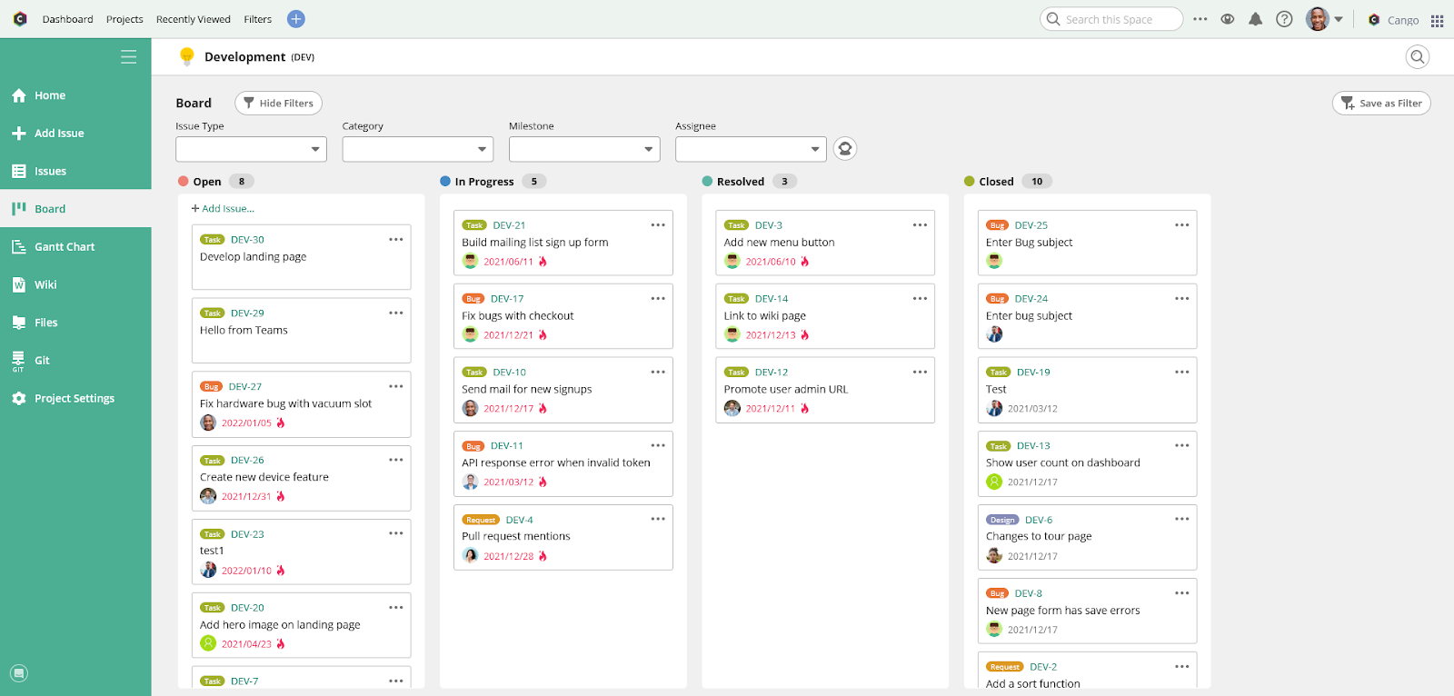 On the Issues page, team members can get a quick overview of each task–for example, whether one team member is working on fixing a new bug or another is developing an upcoming feature—and the task’s overall status.