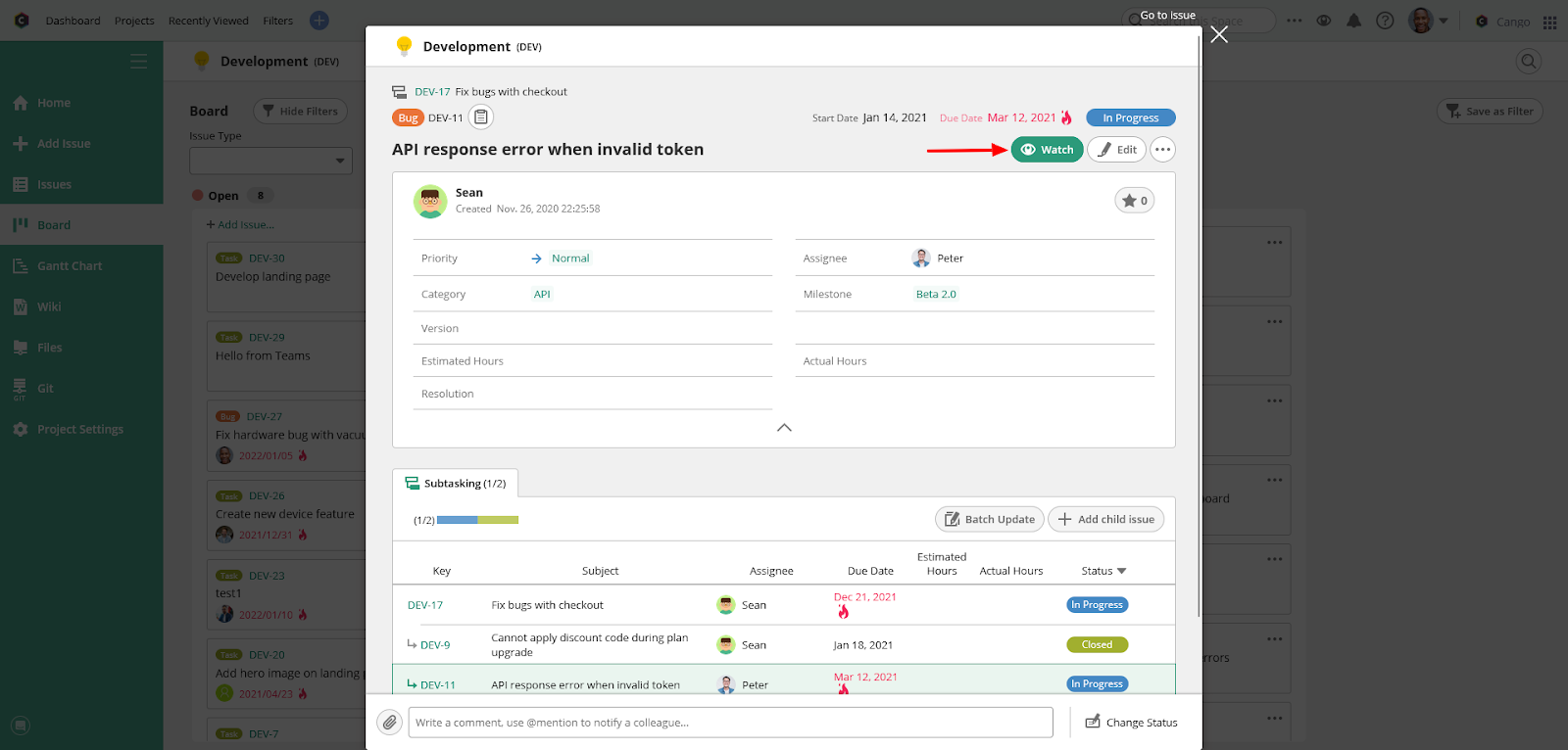 This page also includes helpful information about the task, including its start and due date, assignee, milestone or version, related subtasks, and more.