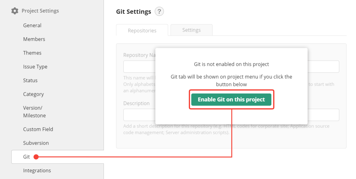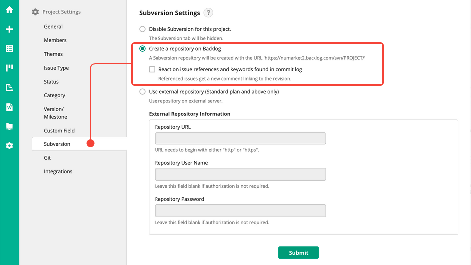 To enable Subversion, go to the Subversion tab under Project Settings and select Create a repository on Backlog.