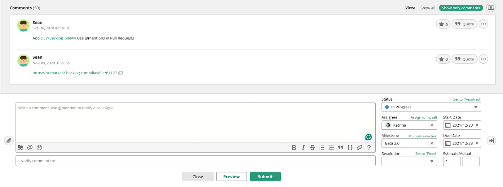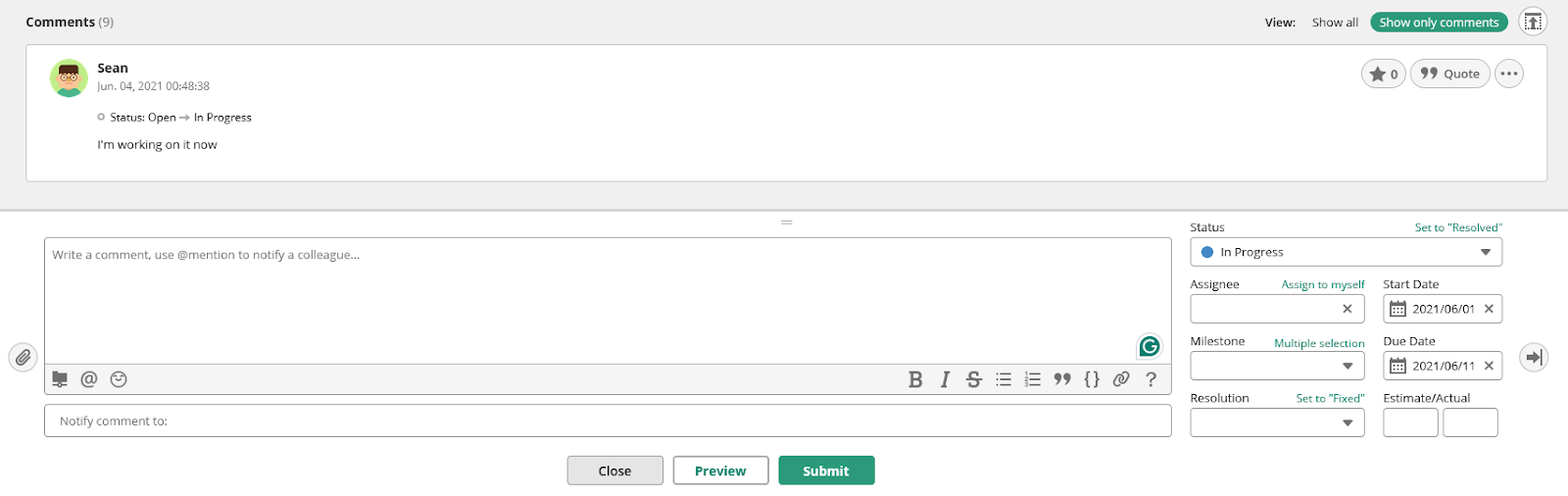 Just open the relevant issue or subtask, scroll down to the comments section, and start typing in the comment field to share your update. Using the comments, you can:
