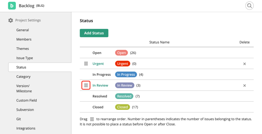 To create a custom workflow in Backlog, access the Status menu in Project Settings and click Add Status.