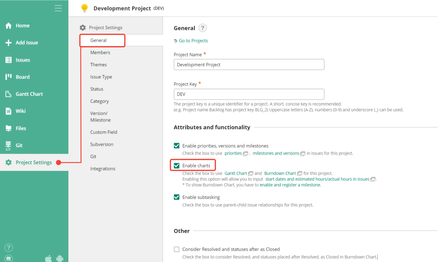 Backlog’s Gantt chart is ideal for analyzing task dependencies, managing resources, and spotting and resolving delays. To use this feature, enable it in Project Settings.