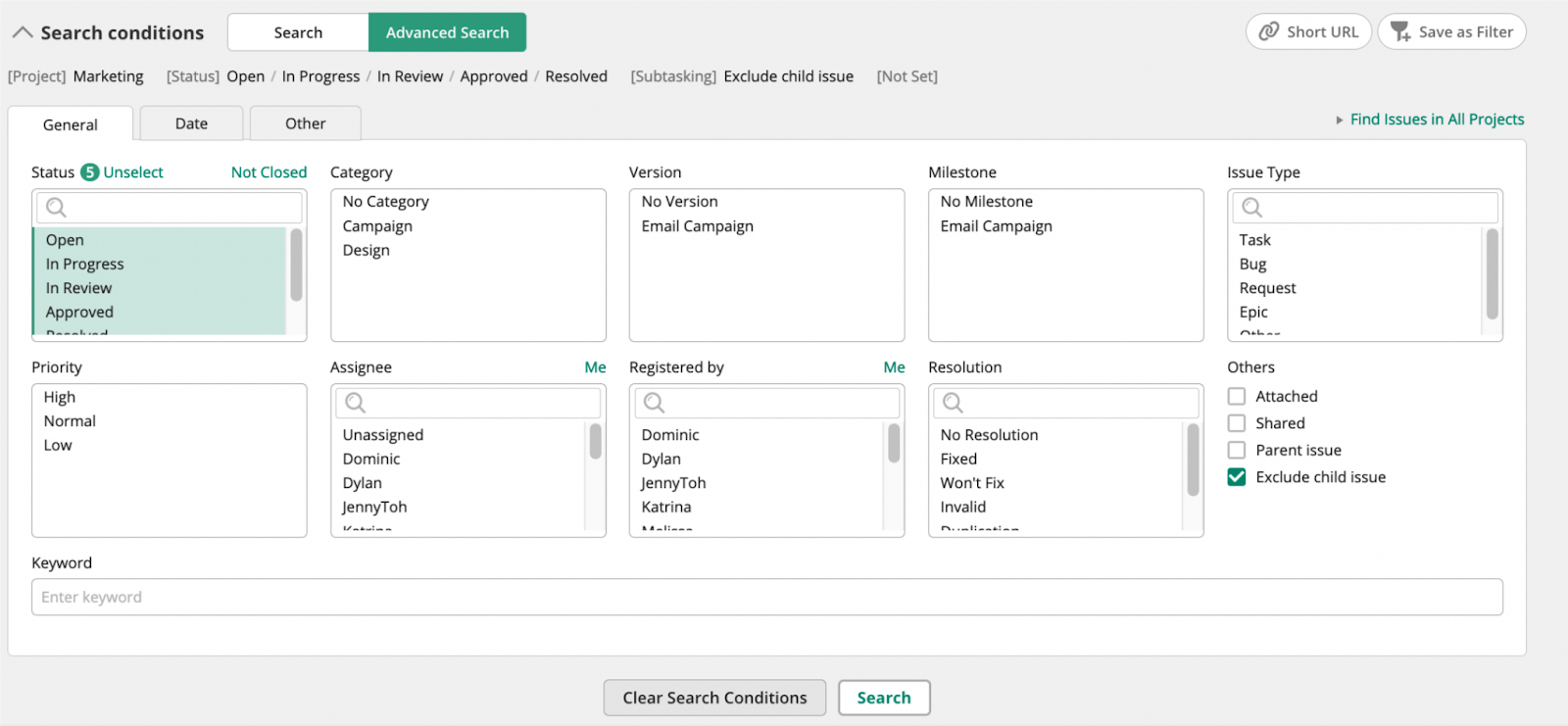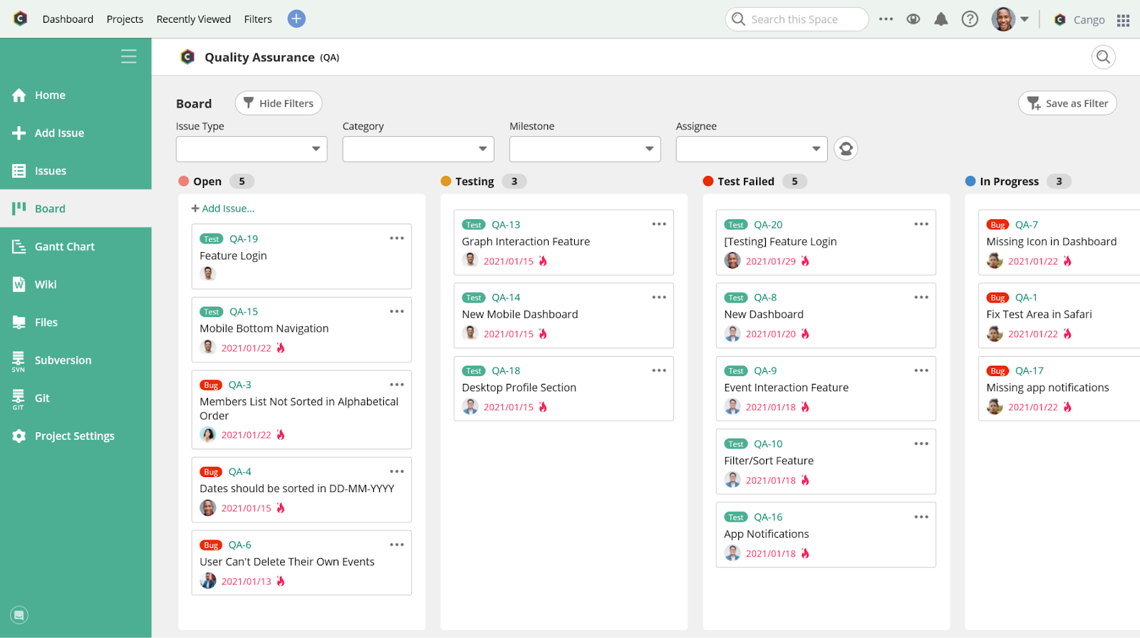 For complex projects, enhance organization with custom issue categories. Create these in the Project Settings menu in the sidebar.