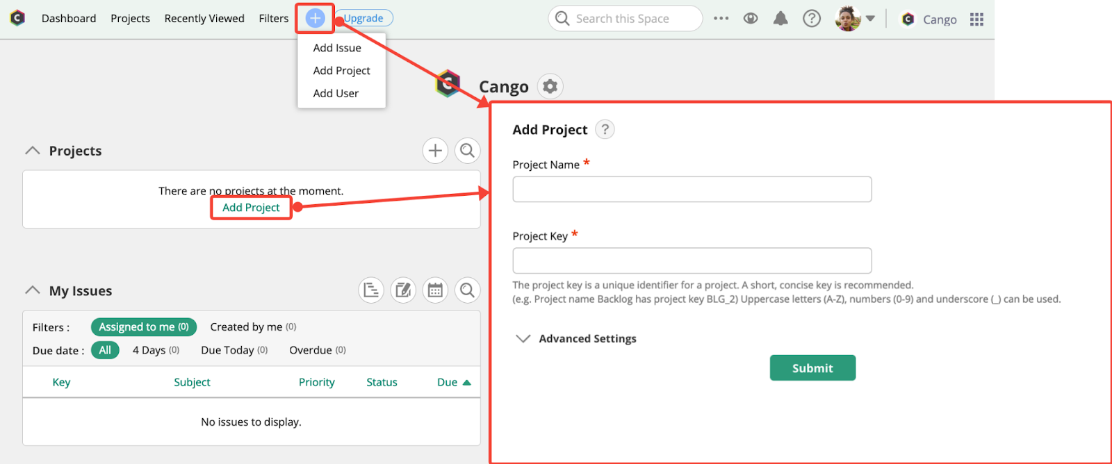 Create a new project directly from your dashboard by clicking the Add Project button or the + icon at the top of the screen. Then, name your project and assign it a Project Key: a short acronym, for example, BGTRK for a bug tracking project or IOSDEV for an iOS development project.