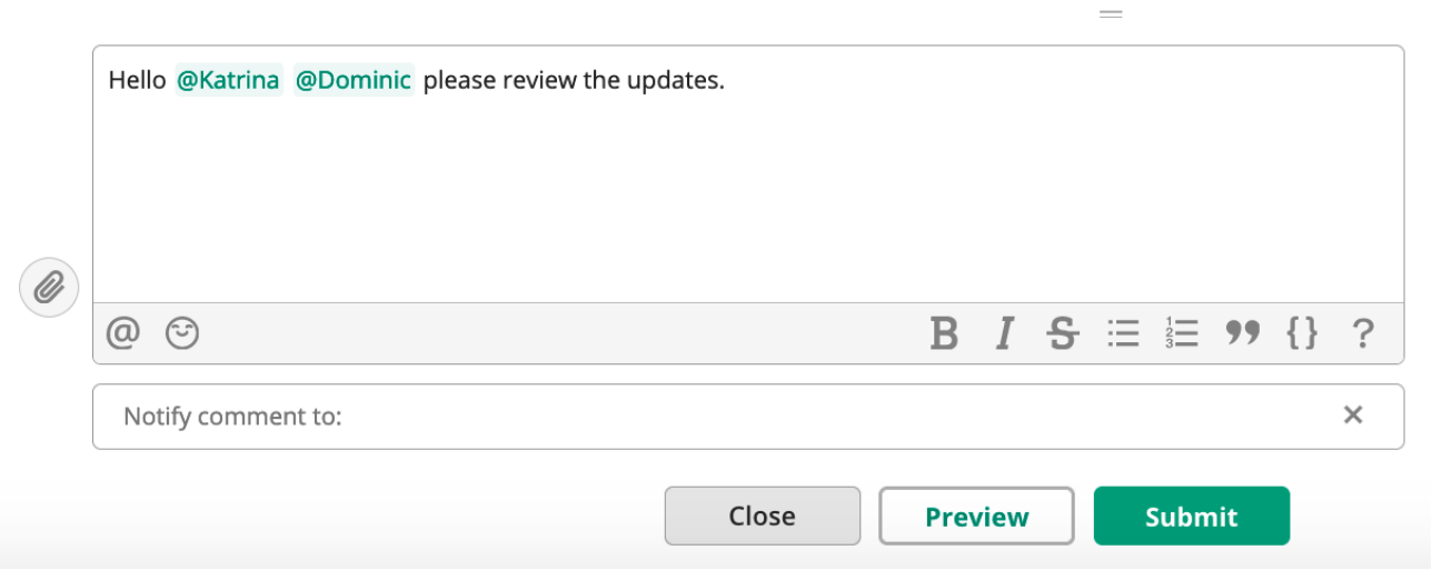 For shorter updates or requests, users can add comments to any Backlog task or subtask, tagging any user to bring it to their attention.