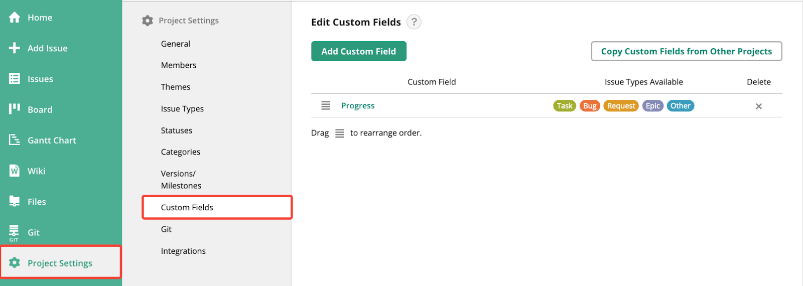 Find the Custom Fields menu in Project Settings.