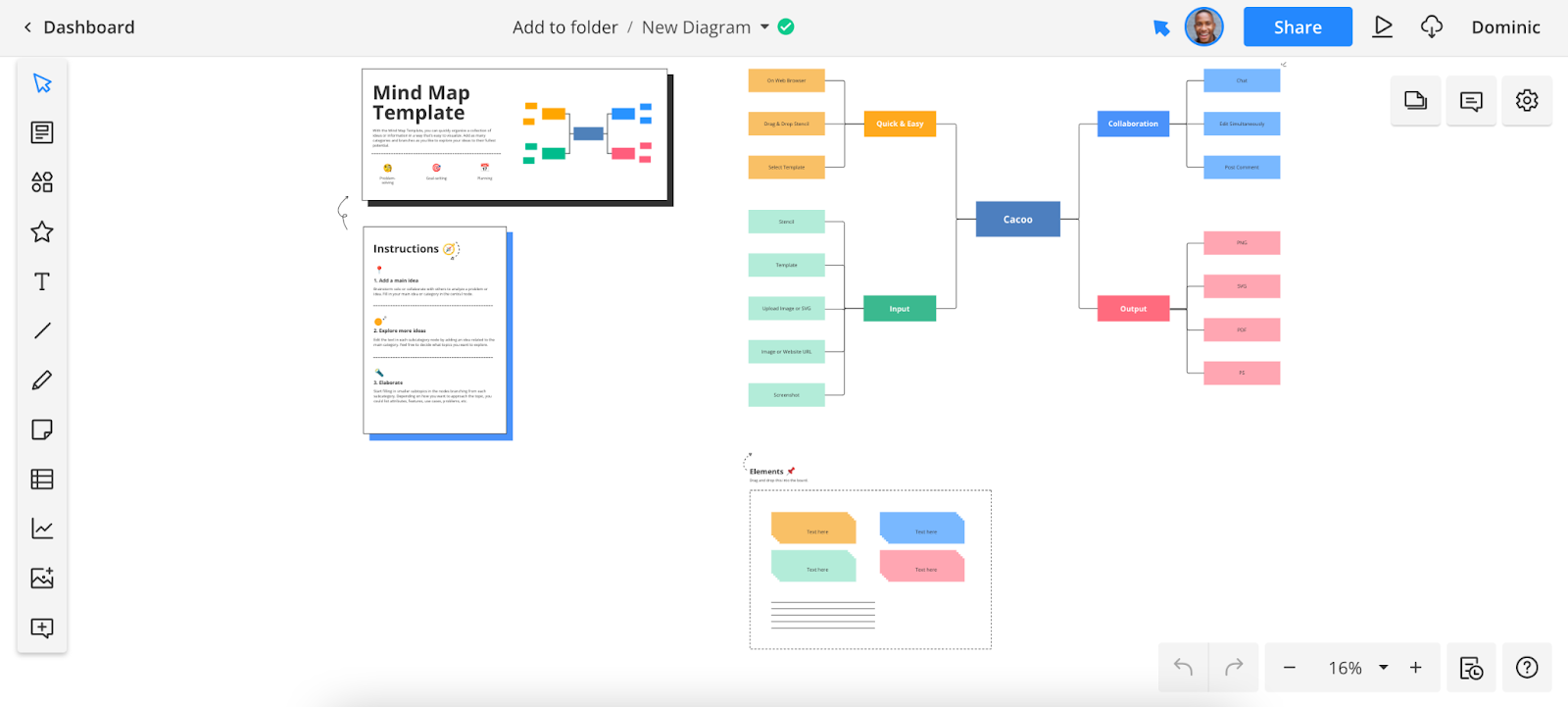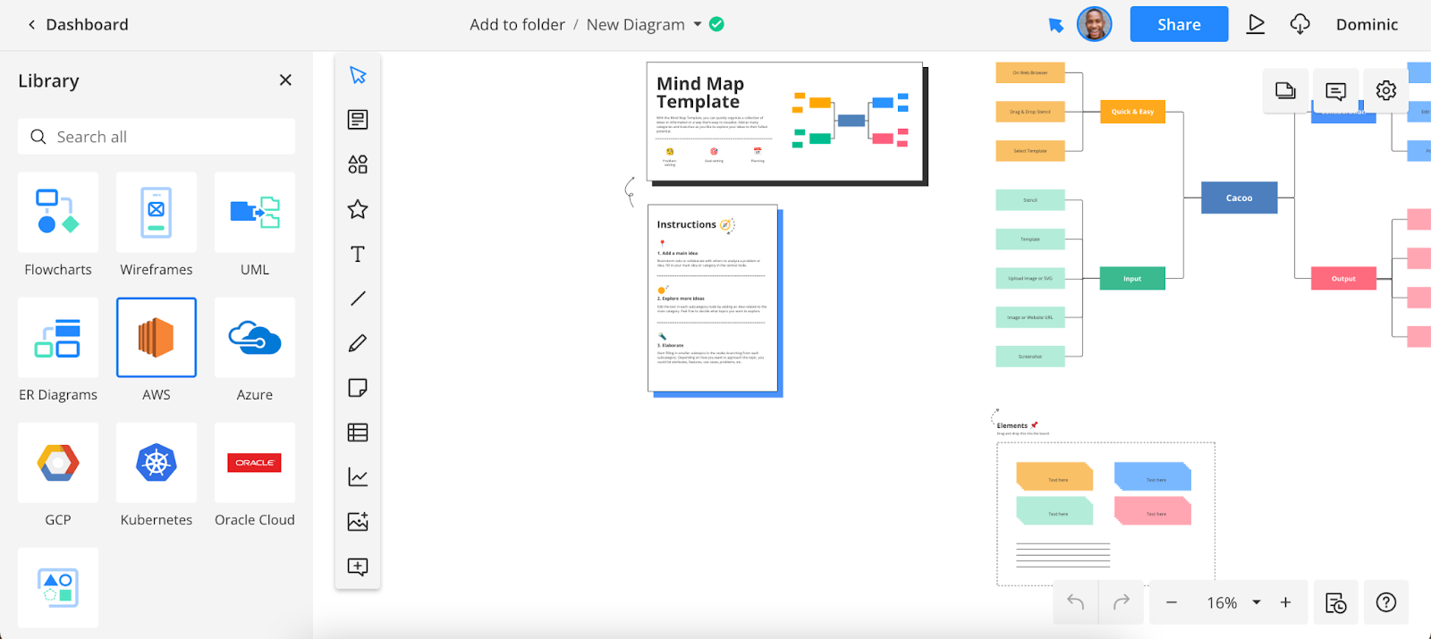 If you’re using a Cacoo template, you’ll see a group of additional shapes and connectors in a box called Elements. To add these to your diagram, just click on them and drag them over to the relevant location.