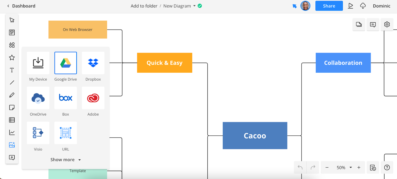 Finally, you can also import external images into your Cacoo mind map. Perhaps you want to add your university’s logo or a picture of a physical project you’re working on. To do so, click on the Import icon on the left-hand toolbar, select the source you’d like to import your file from, and then follow the instructions on the screen.
