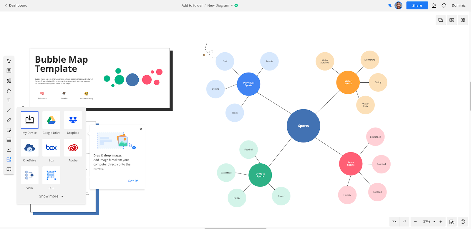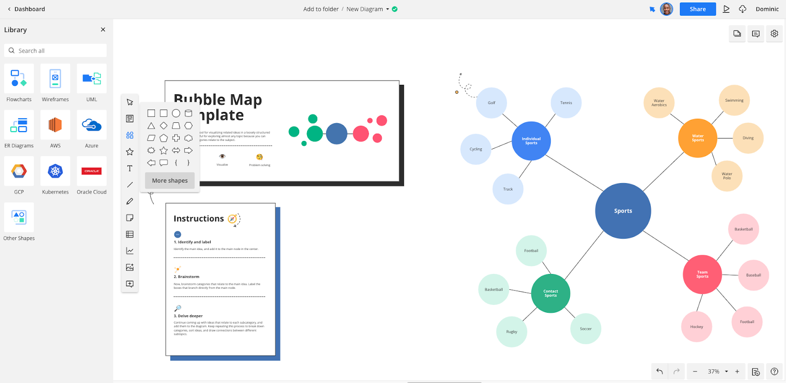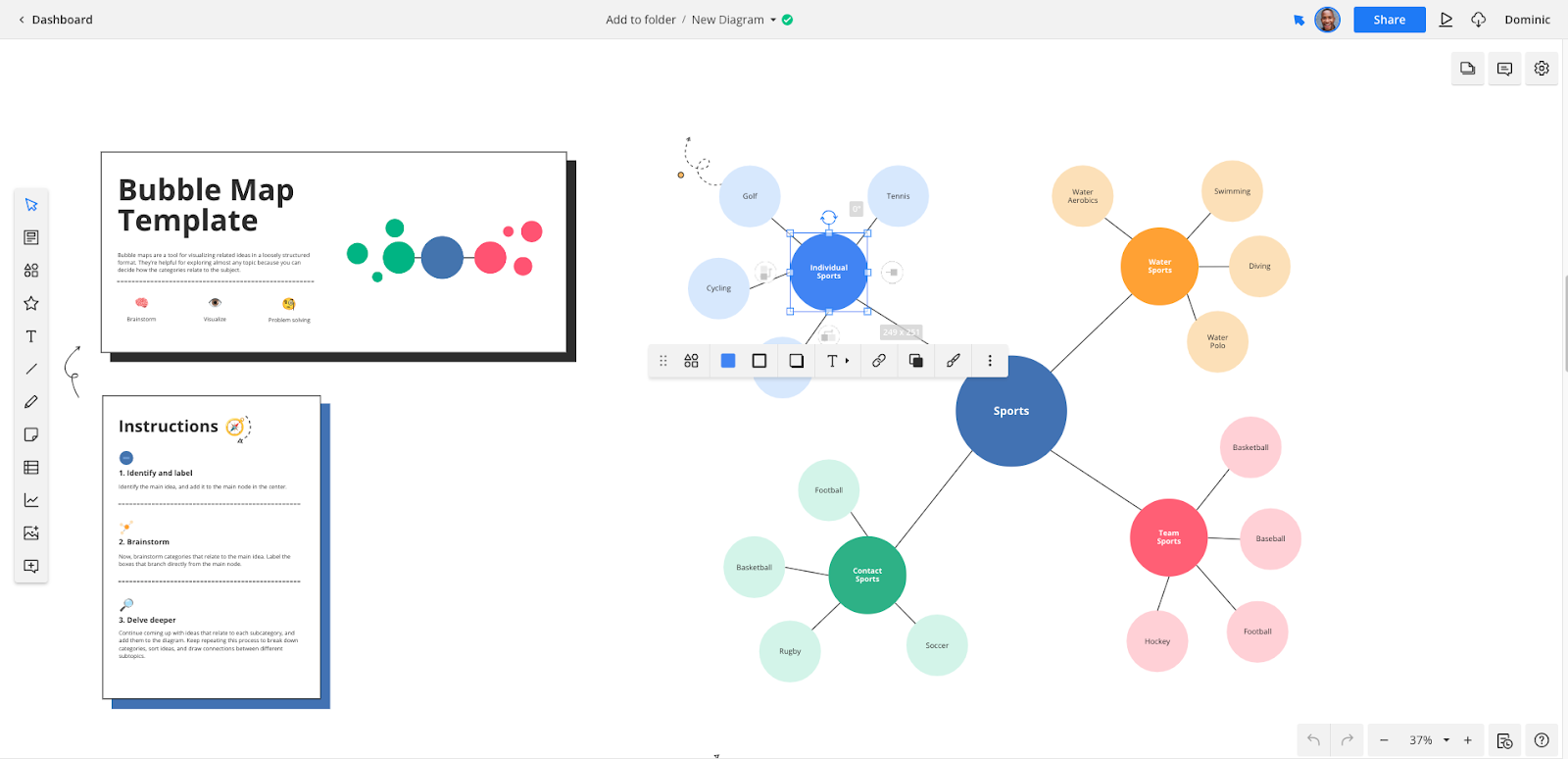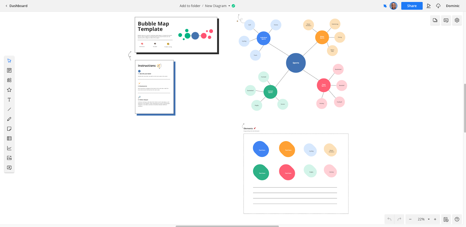 You’ll find a custom mind map template under the Planning and Management tab, but plenty of other templates can also be used for mind mapping tasks, such as the Brainstorm Diagram template or the Bubble Map template.
