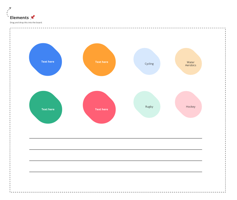 The first option is to drag and drop elements from the template to your mind map design. Every Cacoo template has a panel containing all elements in the mind map design.