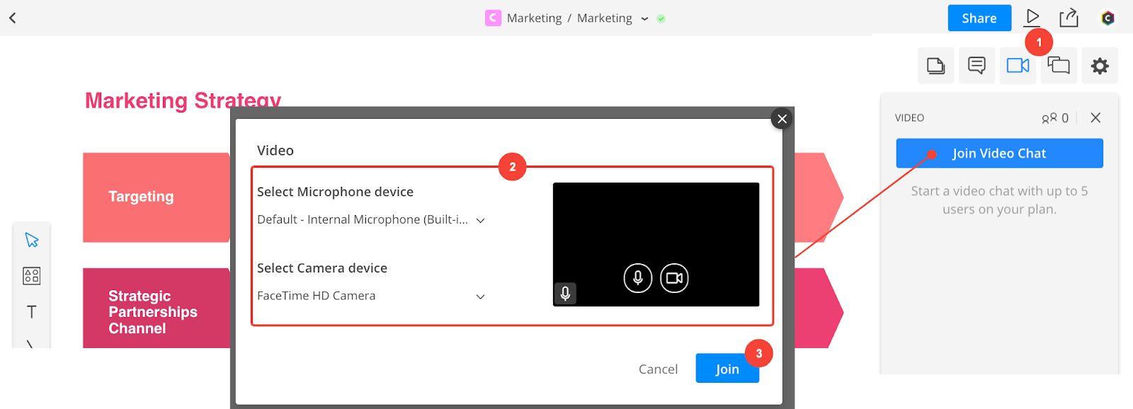 Sometimes, the ideas in your mind map might be so complex that they’re difficult to explain in a text-based chat. In those instances, start a video call directly in Cacoo. Just tap the Video icon to start a video call with all active users.
