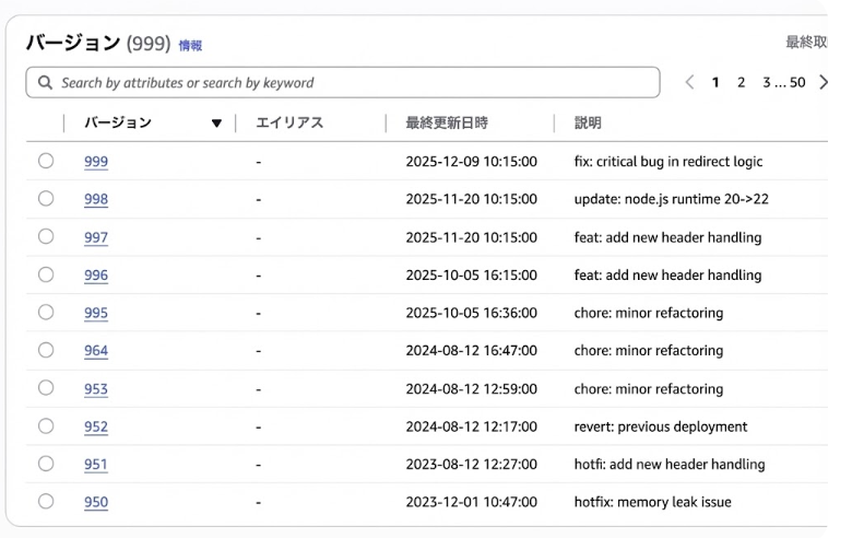 Lambda@Edgeは、コードを更新するたびに新しいバージョンが発行する必要があるため、軽微なミスを修正するだけで過去のバージョンが増殖していきます。