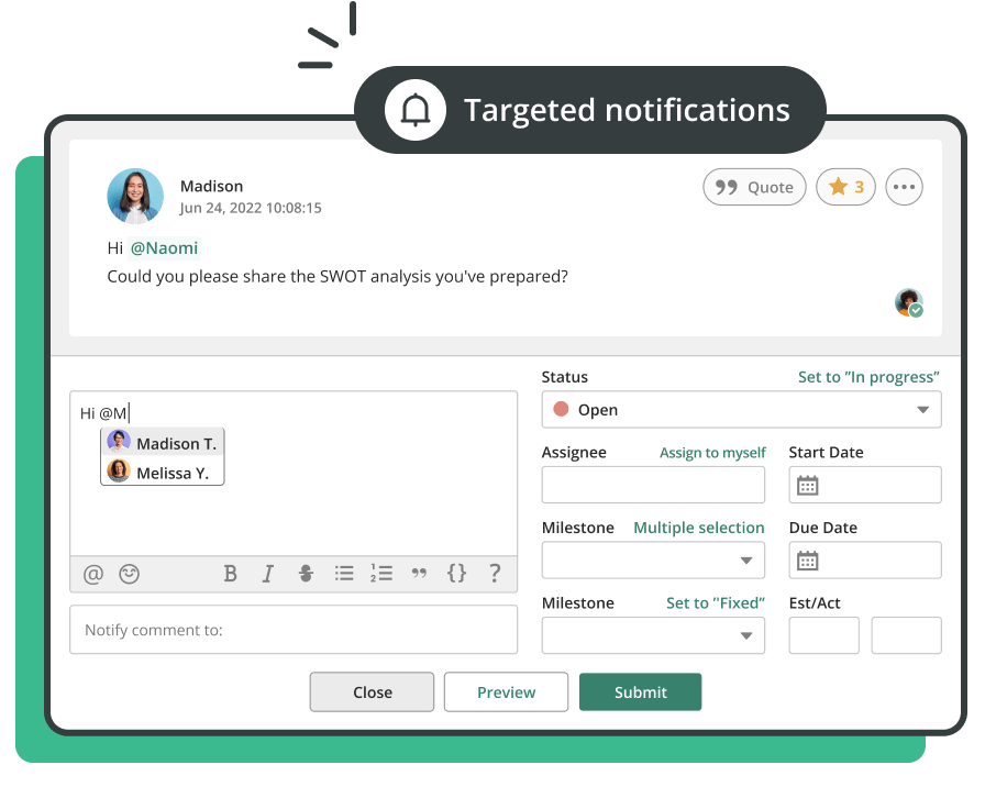 Discuss stakeholder feedback with comments, chat, and video chat.