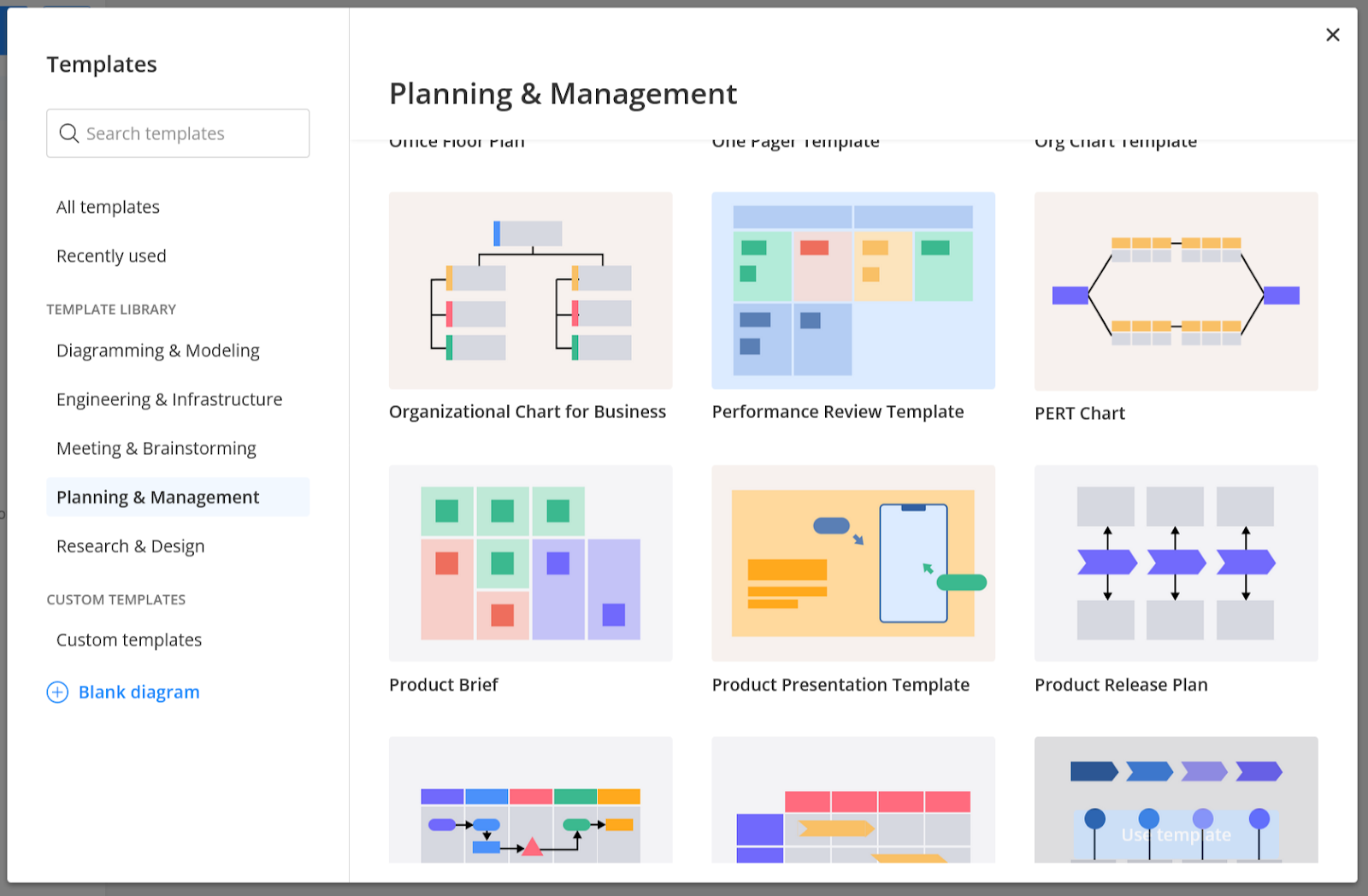 Clicking the template button will open the Cacoo Template Library. Here, you can browse by category or search by keyword to find the perfect design. When creating an onboarding flowchart, you’ll find the most suitable templates in the Planning and management category.