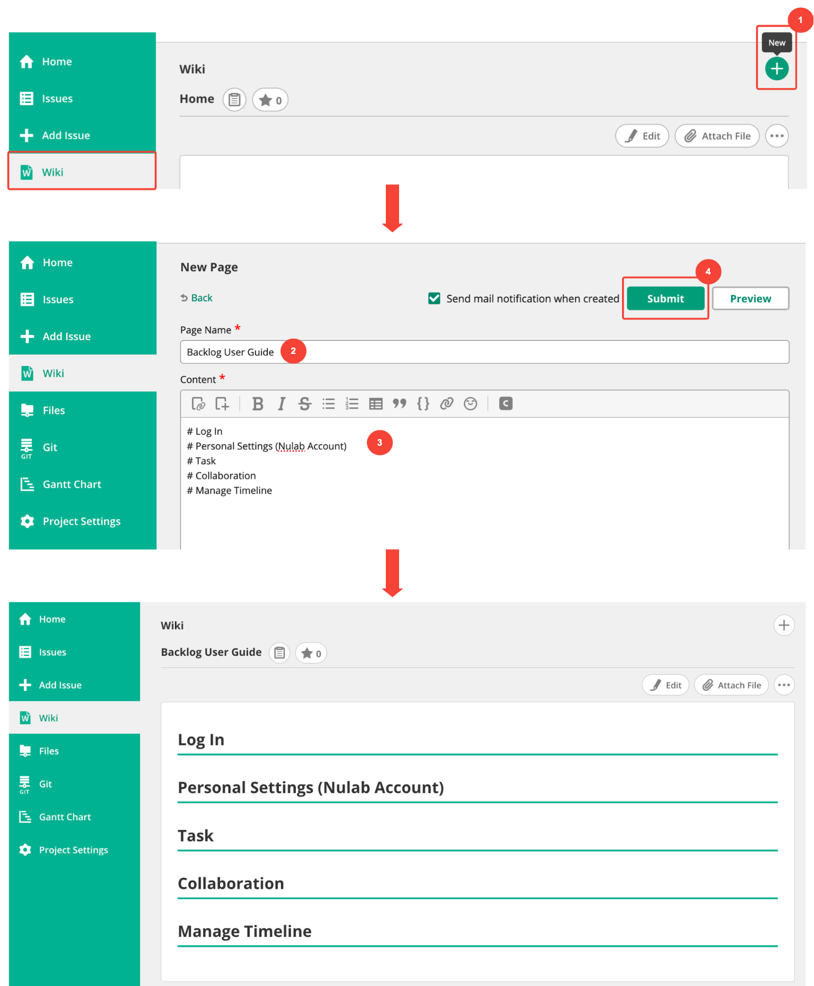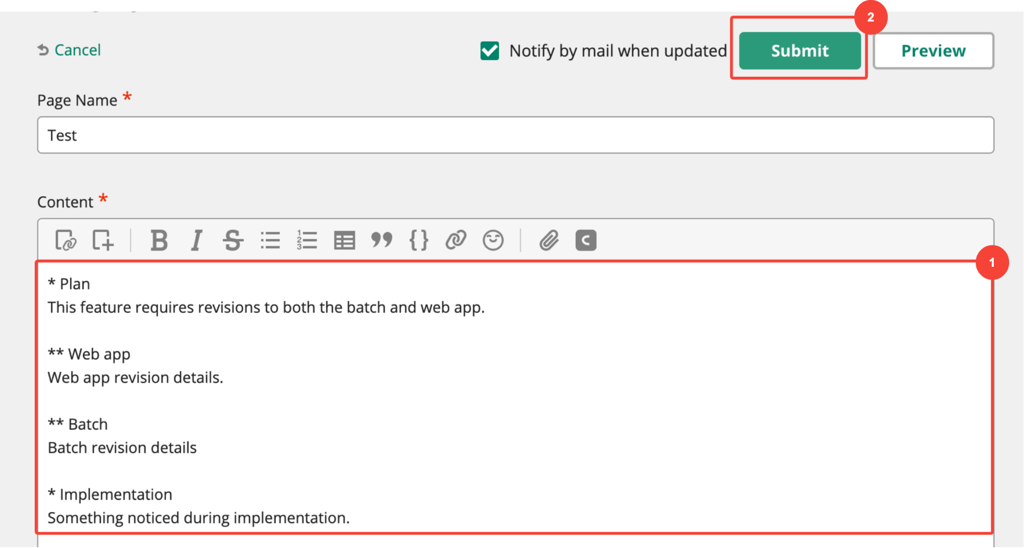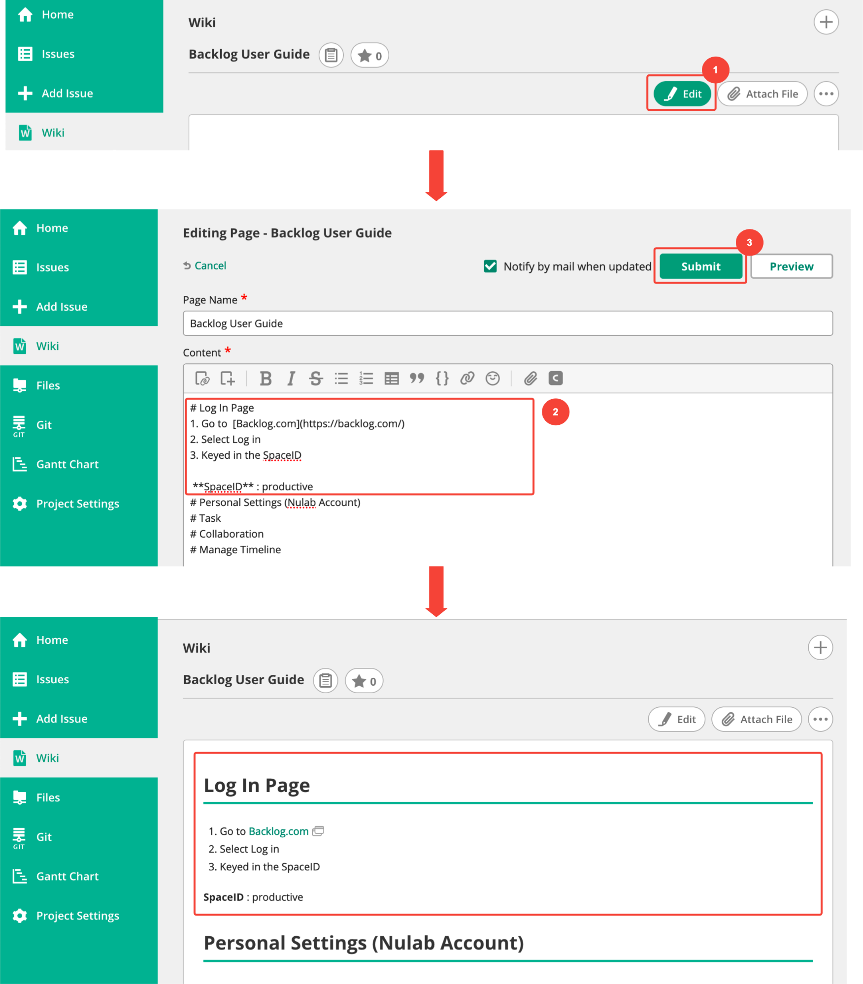 Some wiki services (including Backlog’s wiki feature) will notify the original author of any edits by email. This helps authors monitor contributions for accuracy and stay up to date on changes.