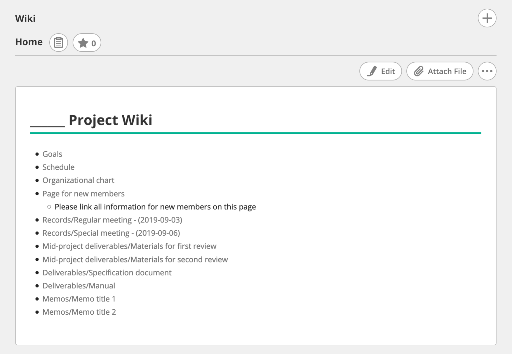 If you have a lot of projects, we recommend standardizing your templates company-wide or department-wide. Doing so will make it easier for employees to get used to a new Wiki when transferring between projects.