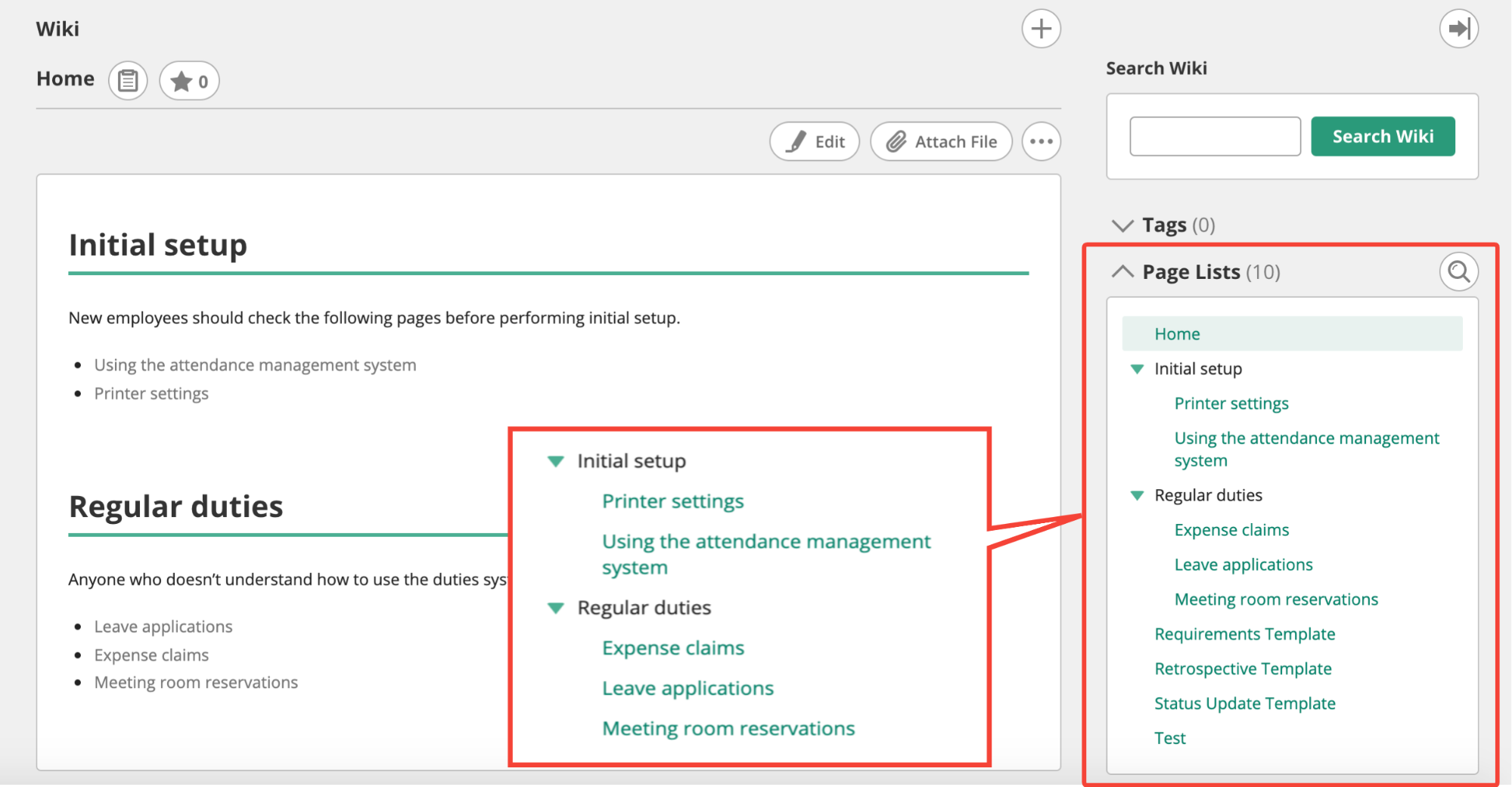 The following is a template that follows this page structure. You can start creating your Wiki by copying and pasting them into your Wiki’s home page.