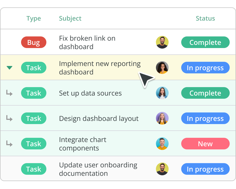 - Parent and child issues: Complex tasks can be broken down into parent and child tasks. Child tasks can be assigned to different team members, helping split large pieces of work into smaller, more manageable tasks.