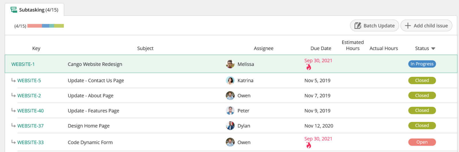 For more complex issues, break the work down into subtasks. This allows you to divide work between multiple team members, which improves your resource allocation and helps you track progress more accurately.