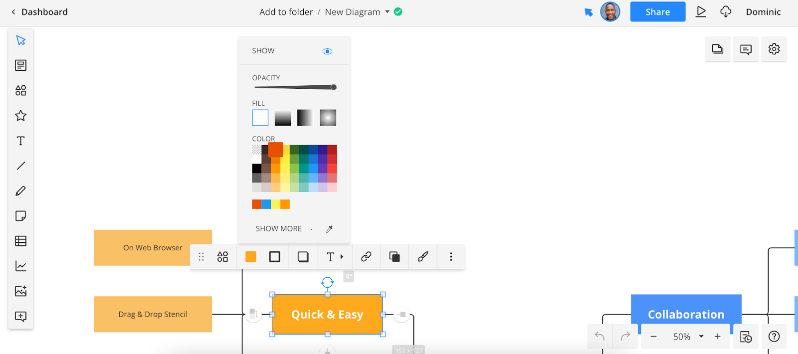 One easy way to level up your mind map is to add color coding for different sections. To change the color of any element on your mind map, simply click on it, then click the color dropper and select your preferred hue.