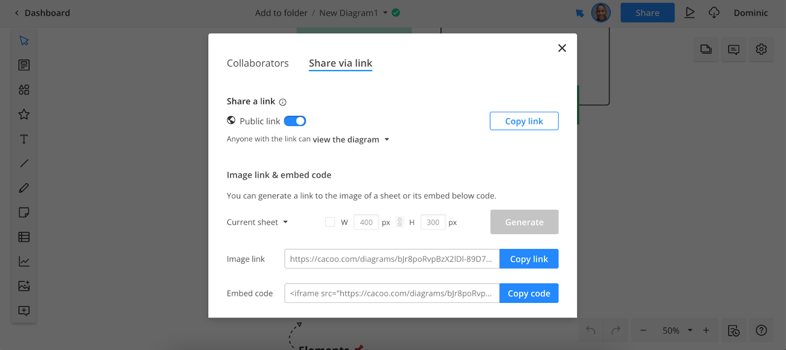 Send the most updated version of your mind map to your teammates or professors by generating a public link. Just click the Share button, then toggle on the public link setting. You can specify whether people accessing this link can edit or only view the diagram.