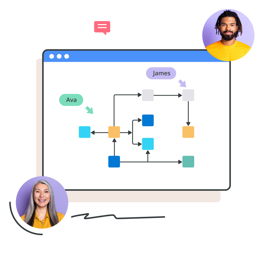 Streamlined feedback: With on-diagram comments, sticky notes, text chat, and multi-user editing, you can collect feedback and quality check more easily.